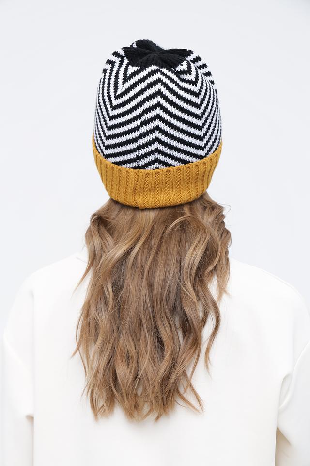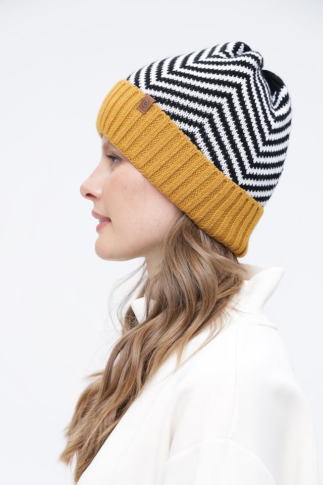 Шапка выполнена из 100% полиакрила – материала, который хорошо сохраняет тепло, не вызывает аллергии и прост в уходе. Верхняя часть шапки выполнена в черно-белую полоску, а нижняя часть – горчичного цвета, создавая интересный контраст.