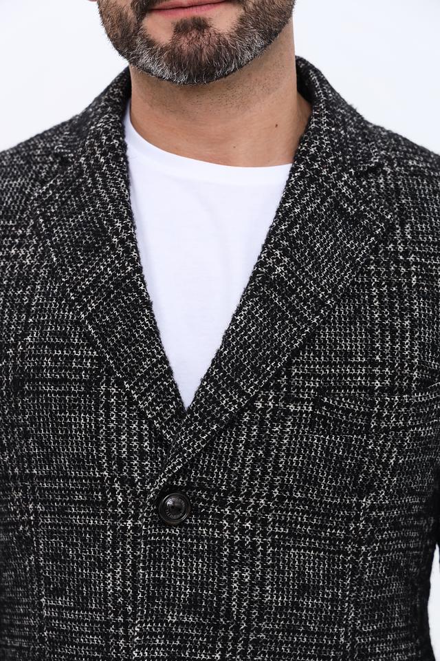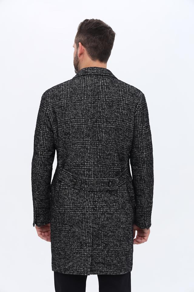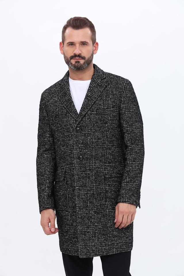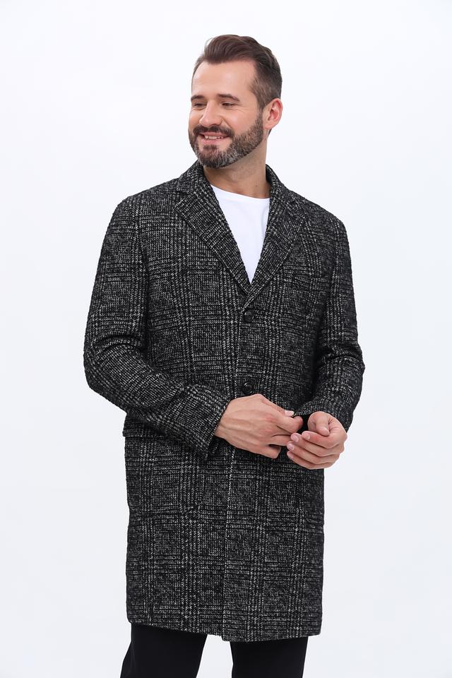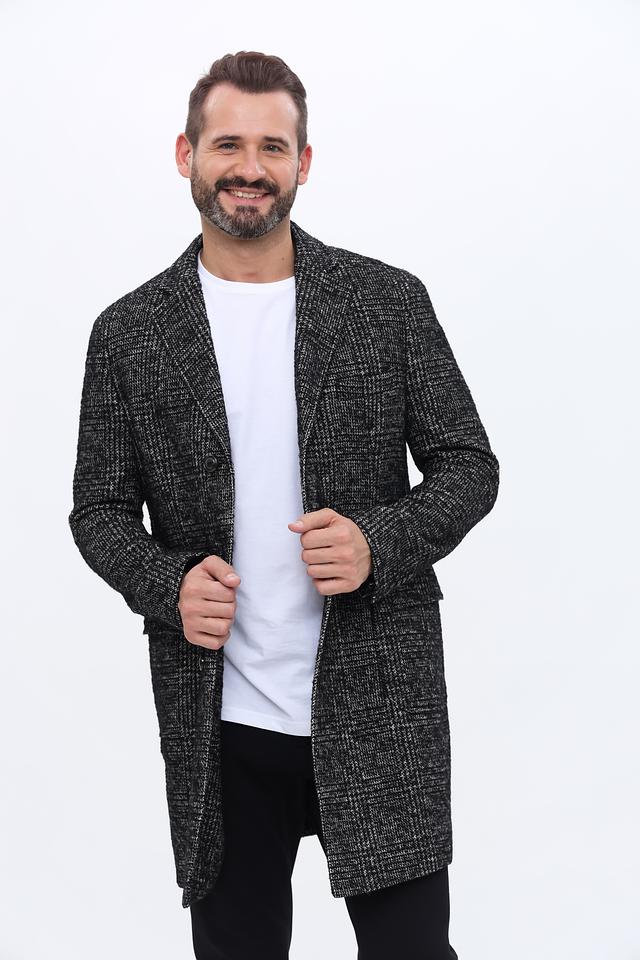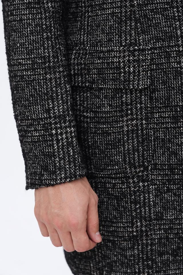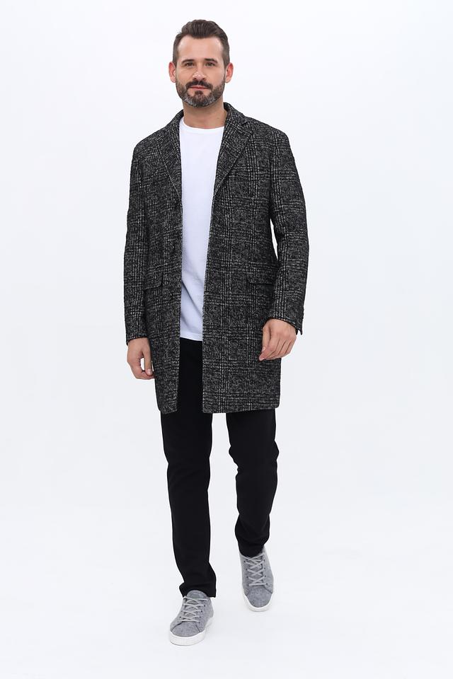 Основной цвет пальто – чёрный, с выразительным рисунком в клетку, сочетающим чёрный и белый цвета. Ткань имеет фактурную поверхность, напоминающую твид. Пальто выполнено из смеси полиакрила, полиэстера, шерсти и эластана, что обеспечивает комфорт и практичность в носке.