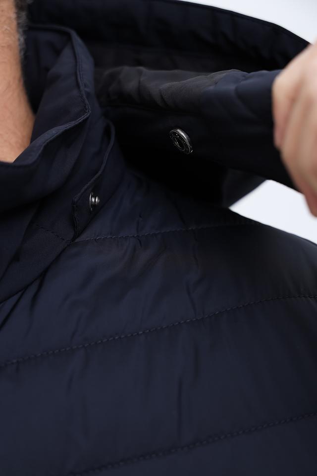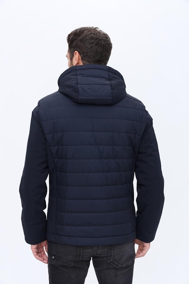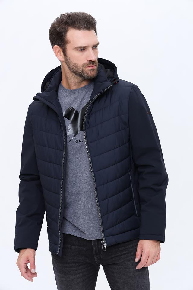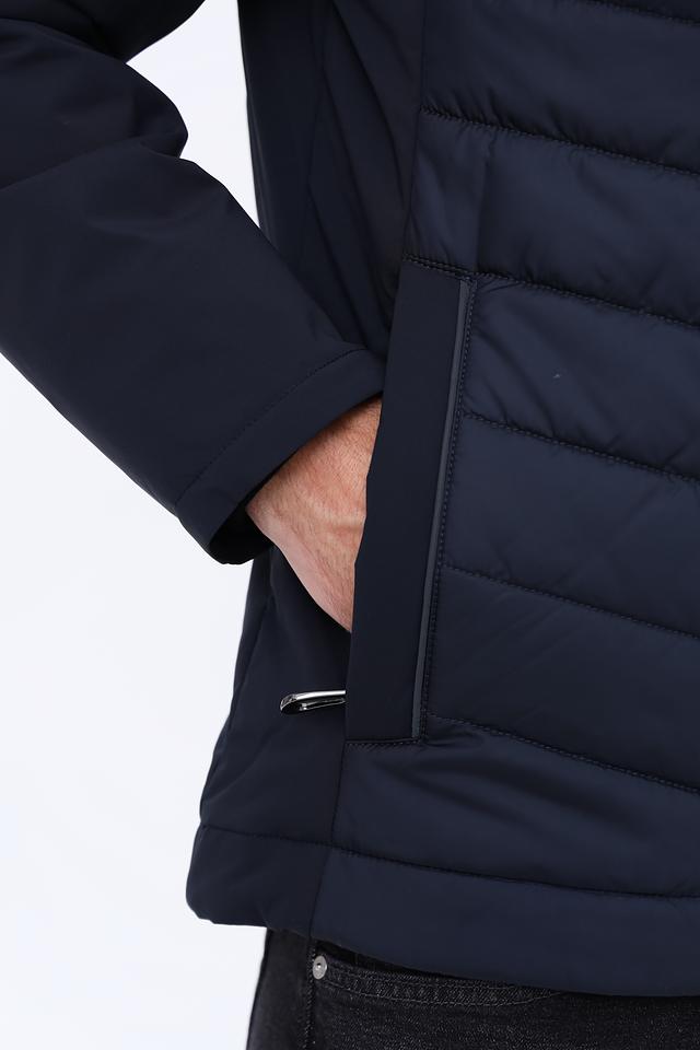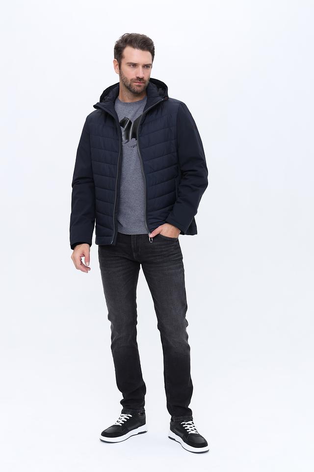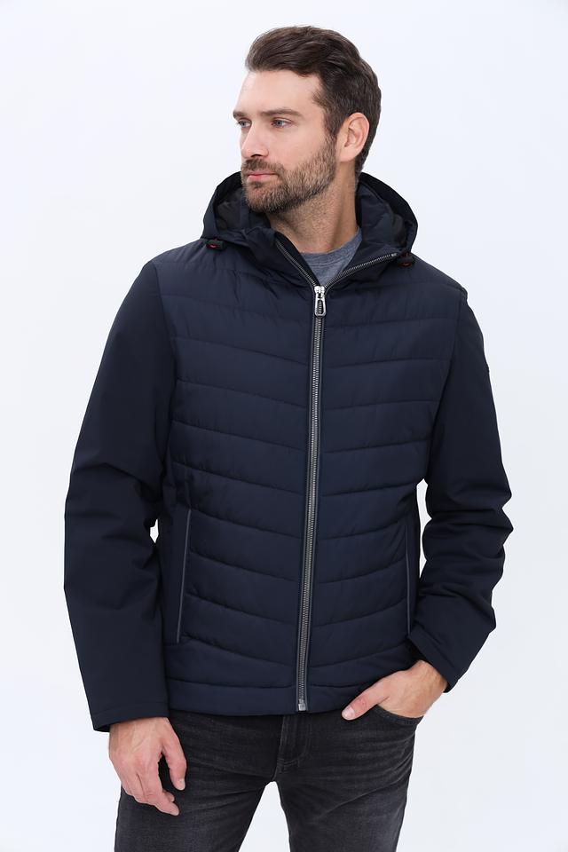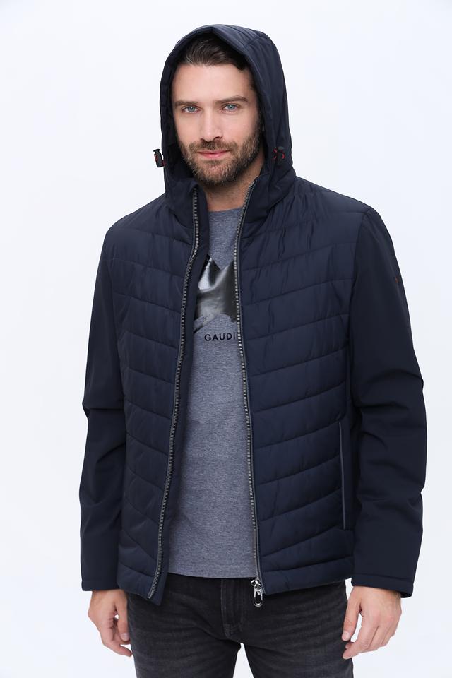 Куртка имеет стеганую фактуру на передней части и гладкую на рукавах и спине, что создает интересный контраст. Капюшон добавляет практичности, а молния по всей длине обеспечивает удобство надевания и снятия.