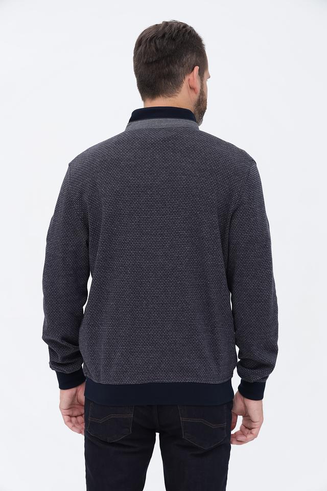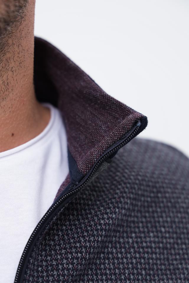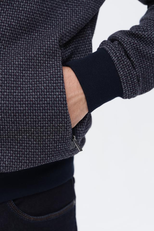 Кардиган имеет классический крой с застежкой-молнией, что позволяет легко регулировать степень тепла. Декоративная отделка на воротнике и манжетах выполнена в тёмно-синем цвете, что добавляет контраста и стиля.