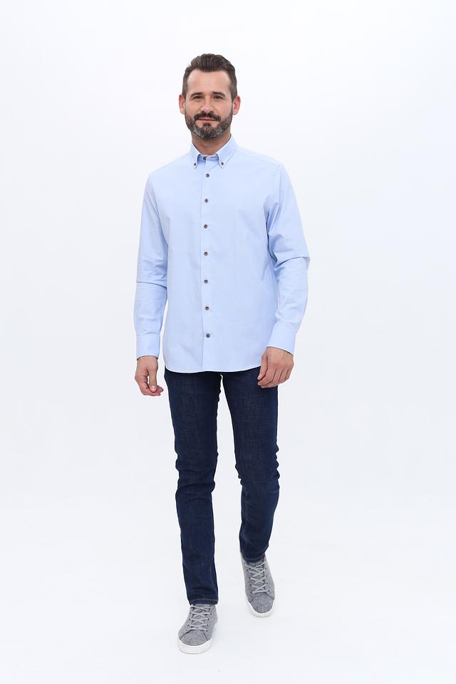 Рубашка имеет классический крой с длинными рукавами и стандартной посадкой. Застежка на пуговицы по всей длине. Воротник рубашки классический, прилегающий.