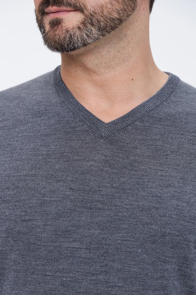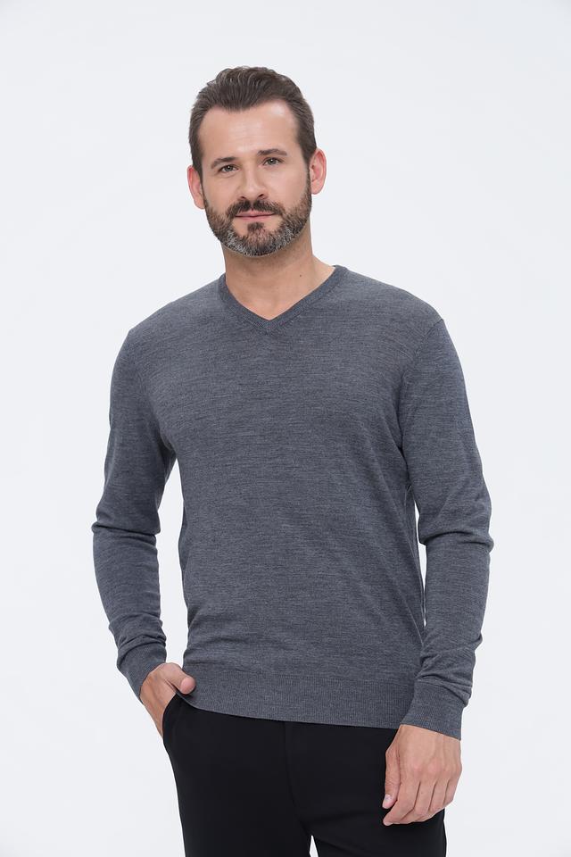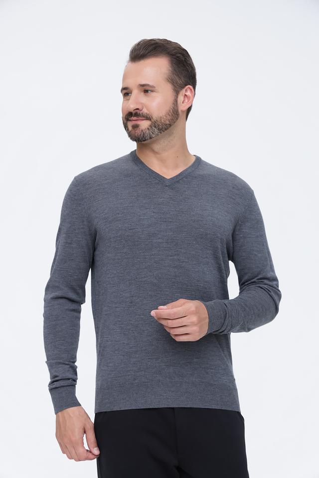 Модель имеет классический V-образный вырез, который подчеркивает линию шеи и делает образ более элегантным. Джемпер имеет длинные рукава и стандартную посадку, подходящую для большинства типов фигур.