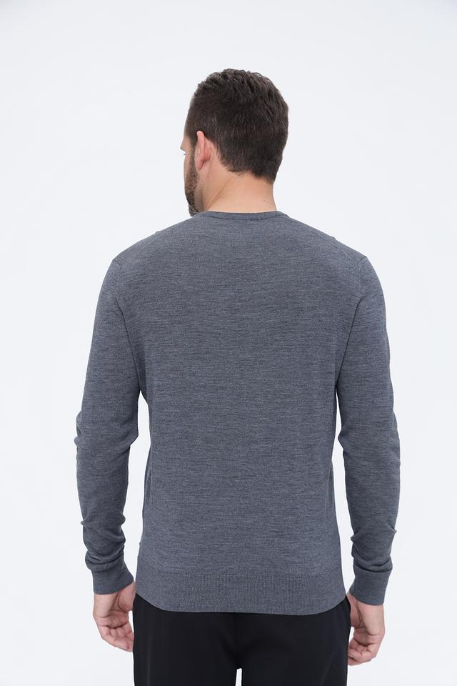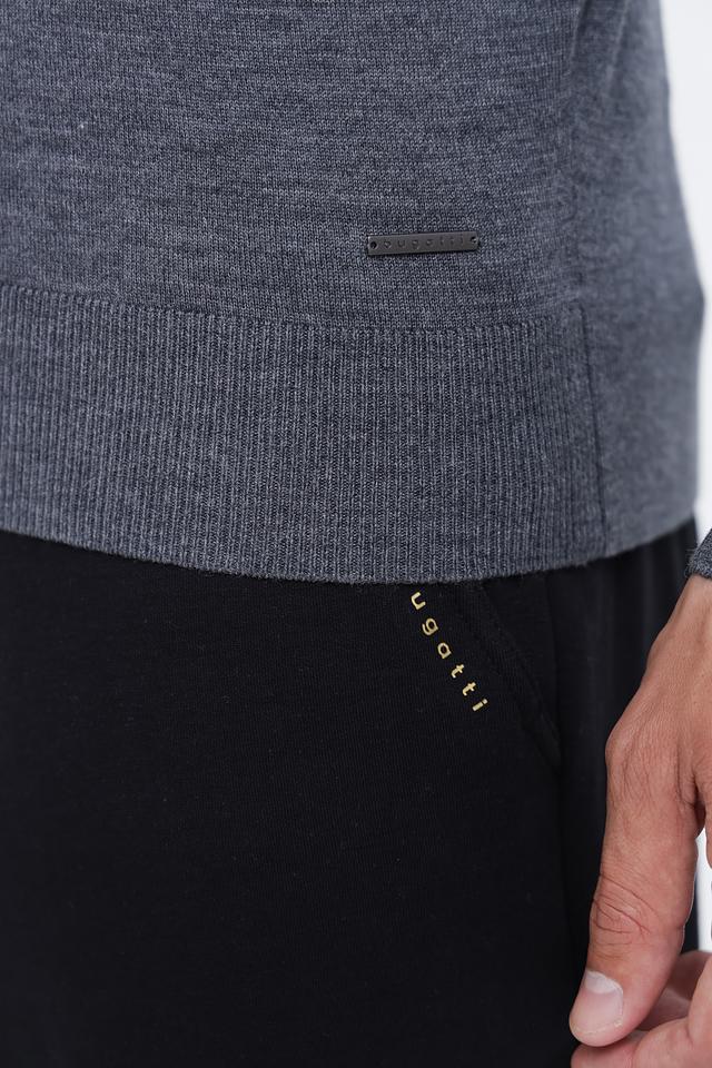 Цвет джемпера – серый, меланжевый, что делает его универсальным и легко сочетаемым с различными элементами гардероба. Текстура вязки гладкая и аккуратная. На левой стороне груди расположен небольшой логотип бренда Bugatti.