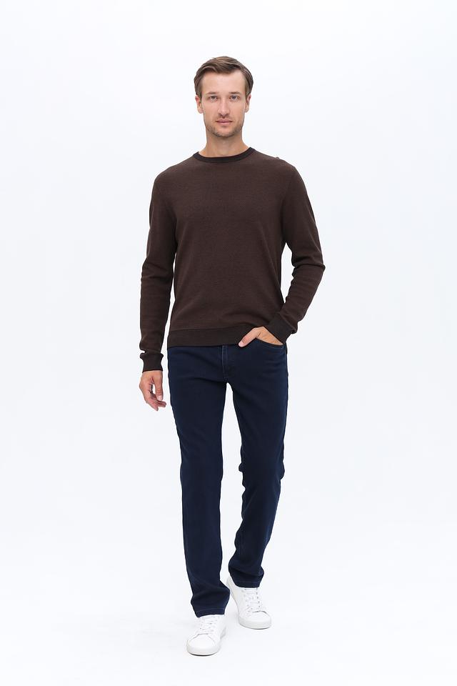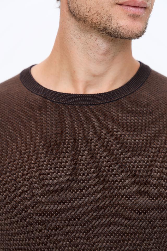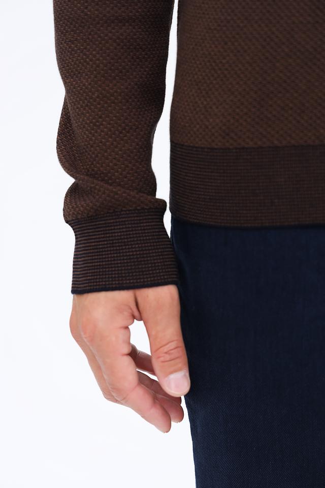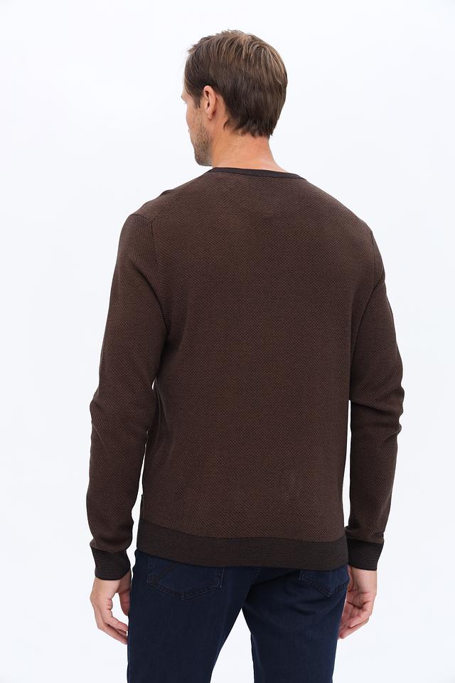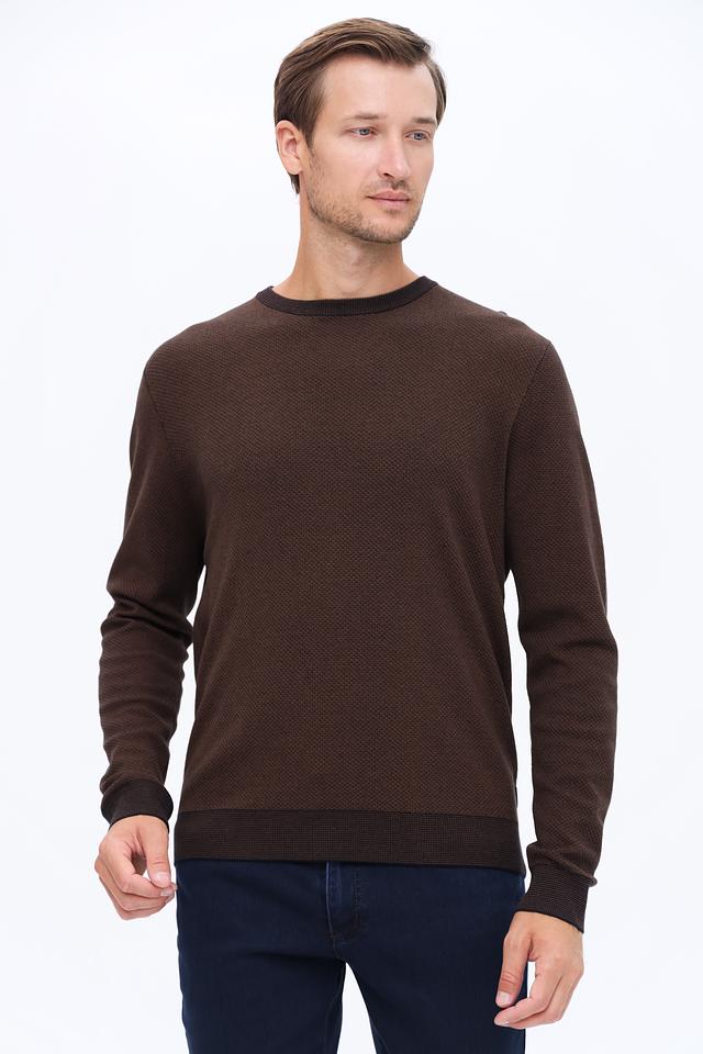 Мужской джемпер Bugatti коричневого цвета с текстурной вязкой и черной отделкой горловины и манжет. Изготовлен из сочетания шерсти и полиакрила, обеспечивая комфорт и тепло. Состав: шерсть 50%, полиакрил 50%