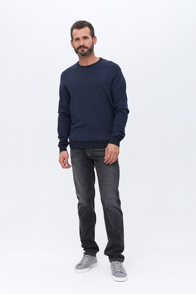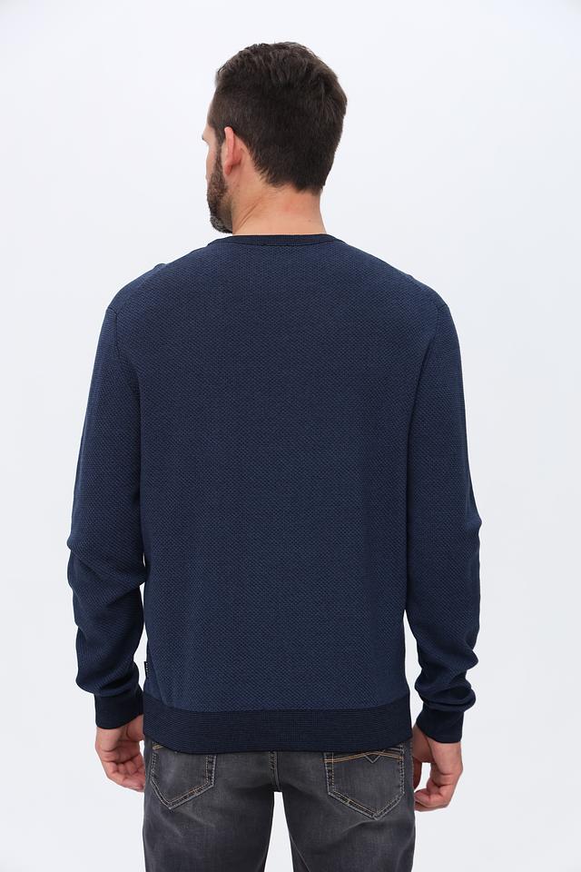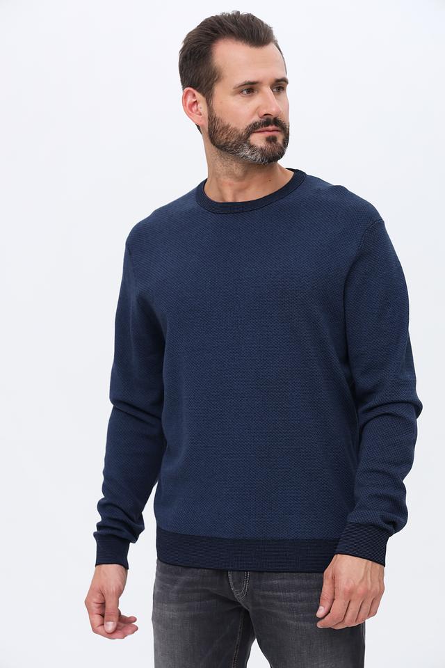 Мужской джемпер Bugatti синего цвета с выраженной текстурой выполнен из мягкого сочетания шерсти и полиакрила. Модель имеет классический крой и круглый вырез горловины, а манжеты и нижний край оформлены плотной резинкой. Состав: шерсть 50%, полиакрил 50%