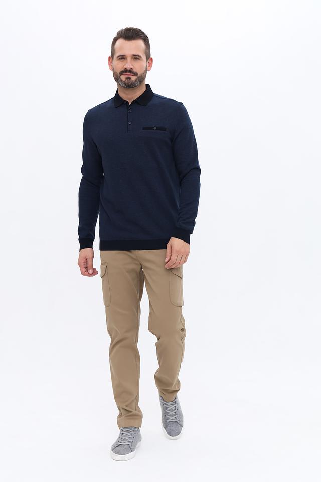 Поло имеет классический крой, воротник-поло с планкой на три пуговицы и декоративный нагрудный карман. Рукава поло – длинные, с манжетами. Контрастная отделка черного цвета на воротнике, манжетах и нижней части поло добавляет выразительности образу.