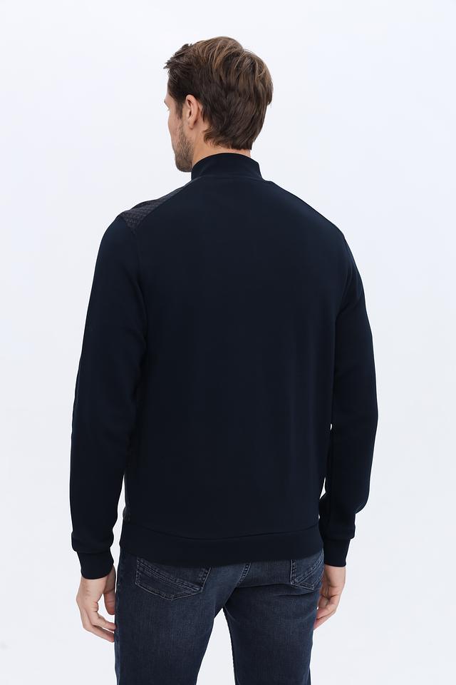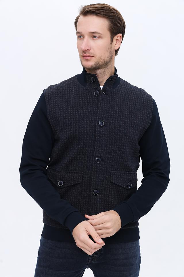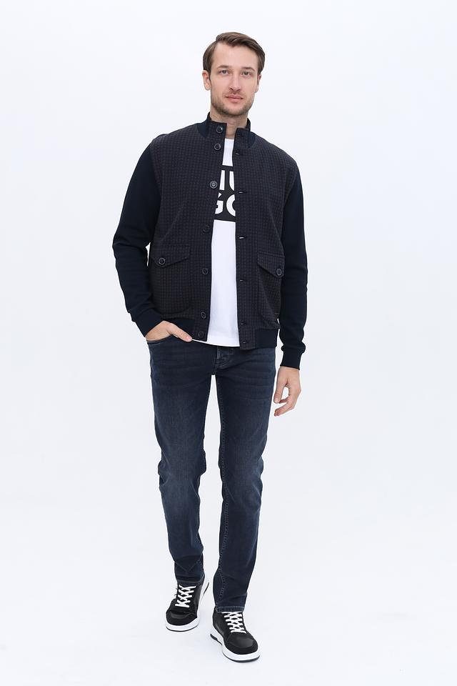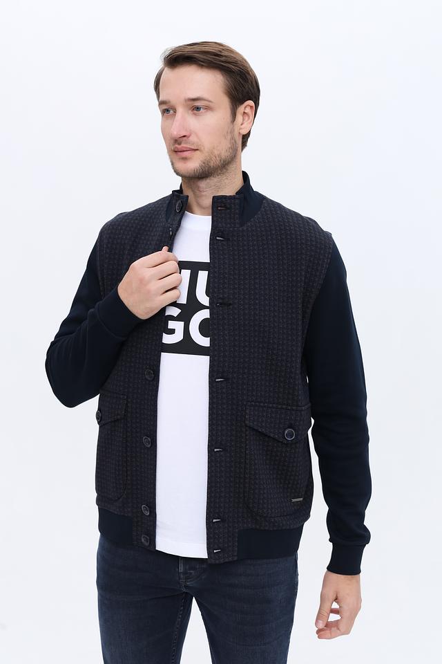 Мужской кардиган Bugatti тёмно-синего цвета – стильная и комфортная модель с комбинированным дизайном. Изготовлен из хлопка с добавлением полиэстера, имеет фактурную вставку и удобную застёжку на пуговицы. Состав: хлопок 90%, полиэстер 10%