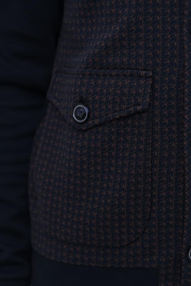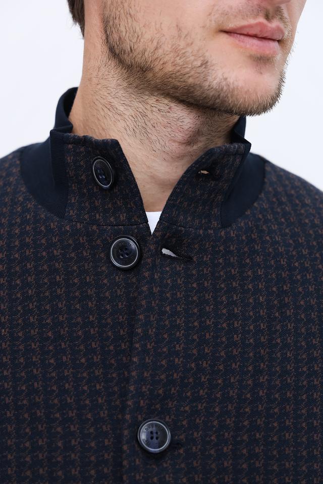 Передняя часть и рукава кардигана выполнены из гладкого трикотажа, а центральная часть и плечи – из фактурного материала с геометрическим рисунком. Застёжка на пуговицы обеспечивает удобство ношения, а воротник-стойка добавляет элегантности.