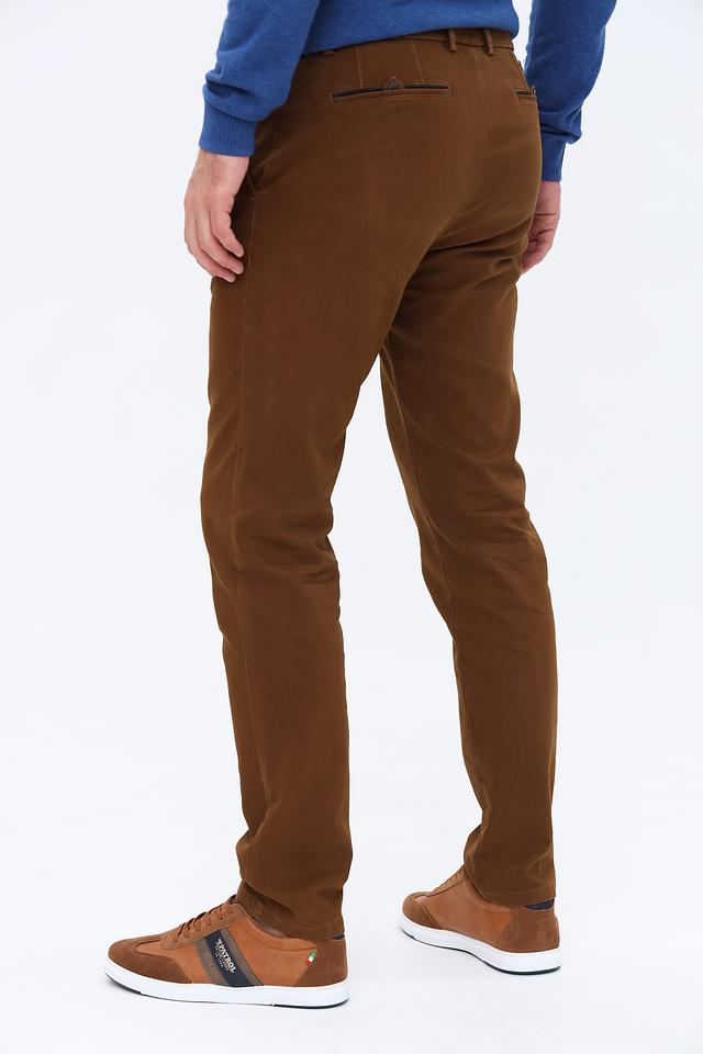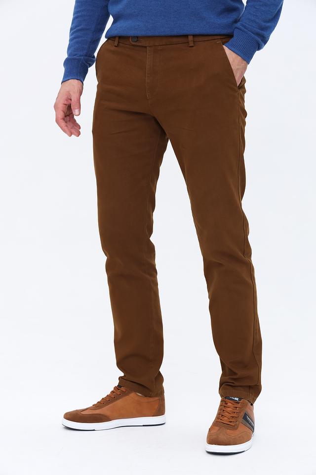 Брюки выполнены из высококачественного хлопка с добавлением эластана, что придает им мягкость, эластичность и устойчивость к сминанию. Коричневый цвет делает их универсальным элементом гардероба, который легко сочетается с различными видами верхней одежды и обуви.