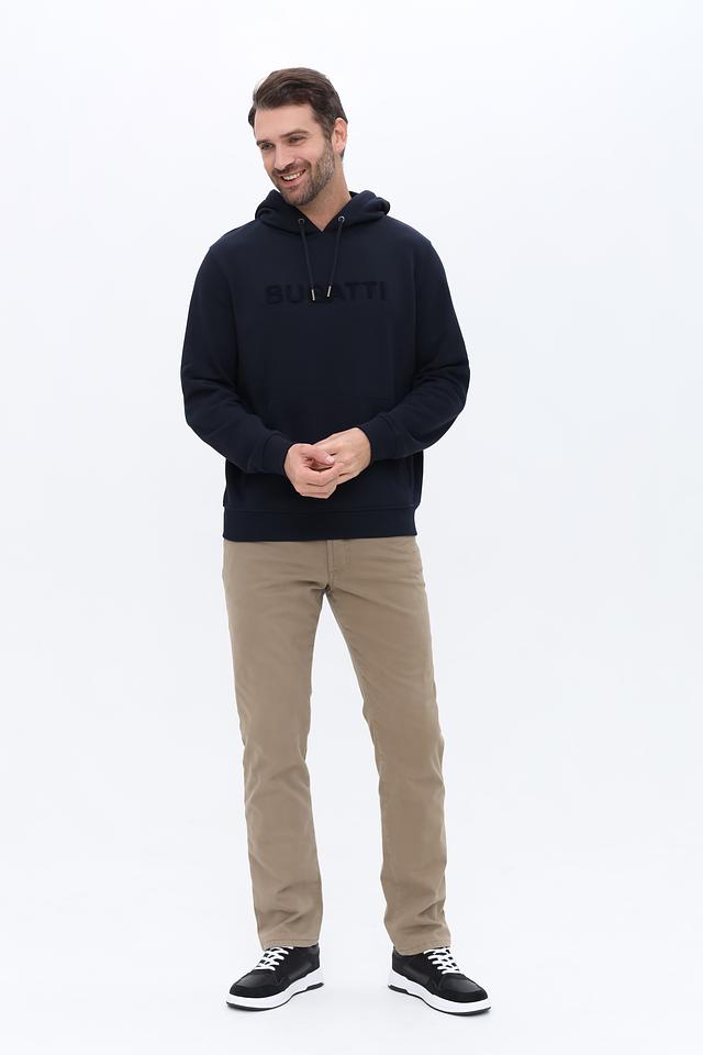 Толстовка выполнена из высококачественного хлопка (87%) с добавлением полиэстера (13%), что делает ее приятной на ощупь, дышащей и износостойкой. На груди расположен логотип бренда Bugatti, выполненный в тон изделия, что придает ей лаконичный и стильный вид.