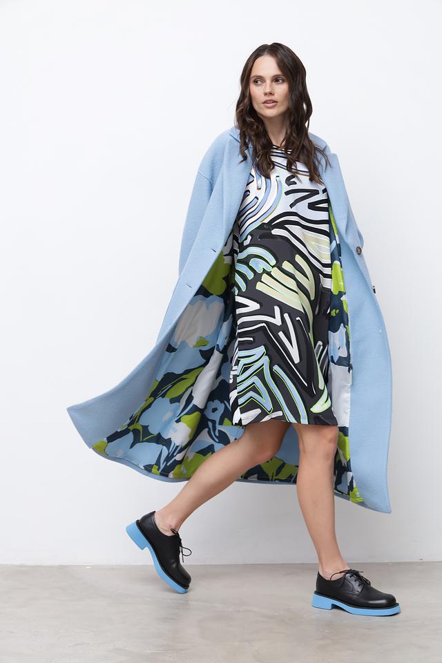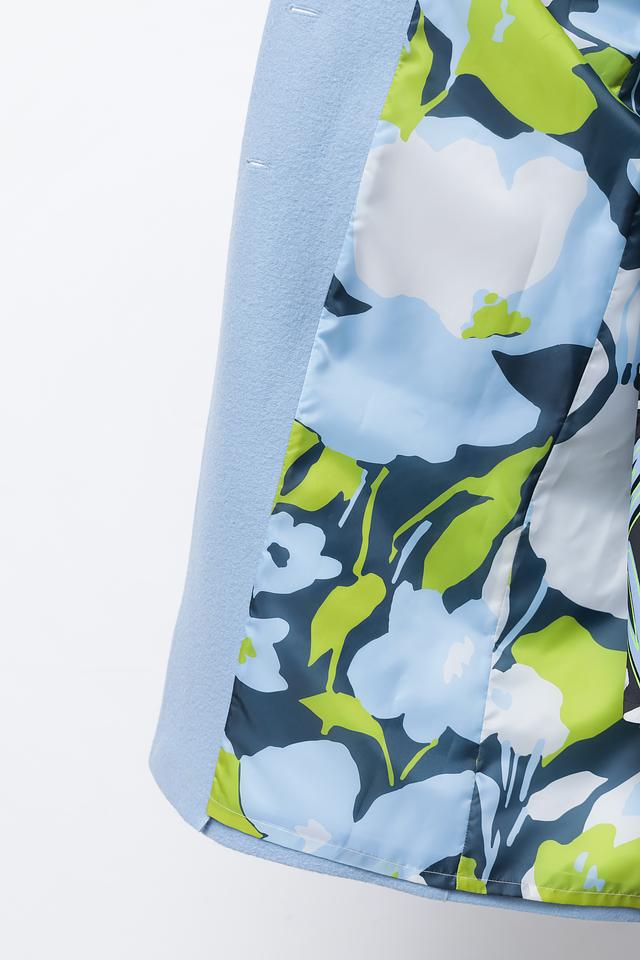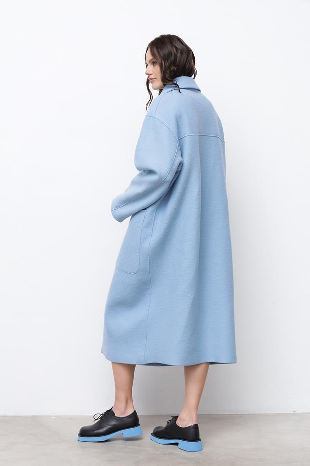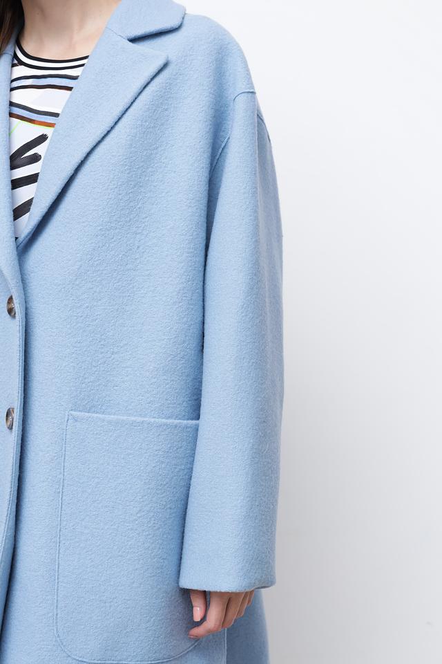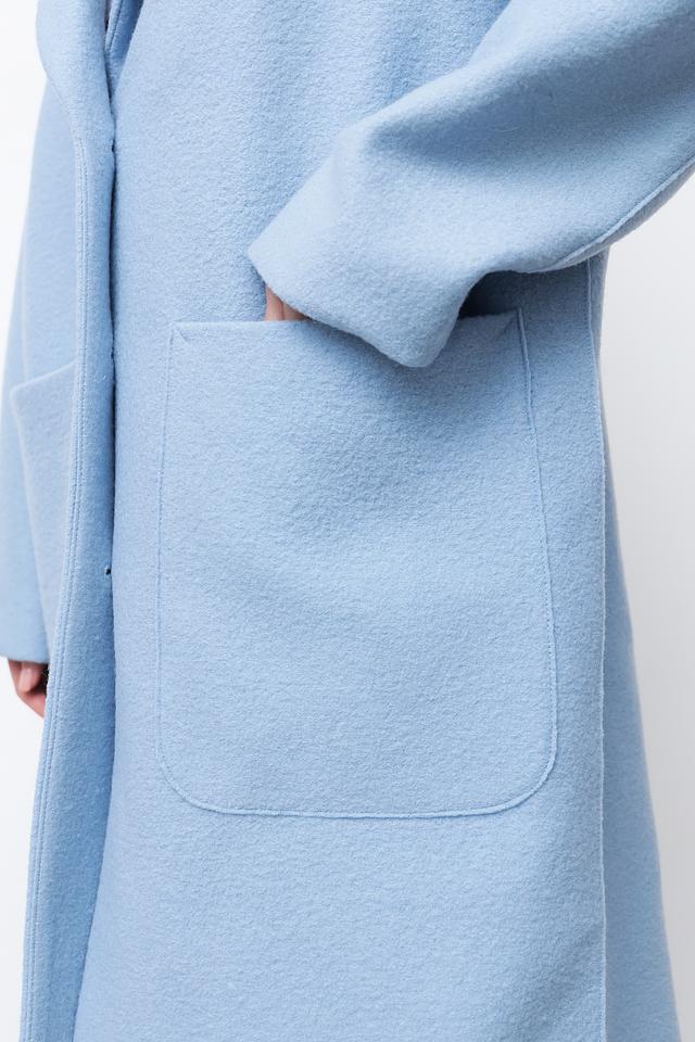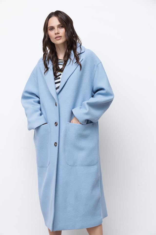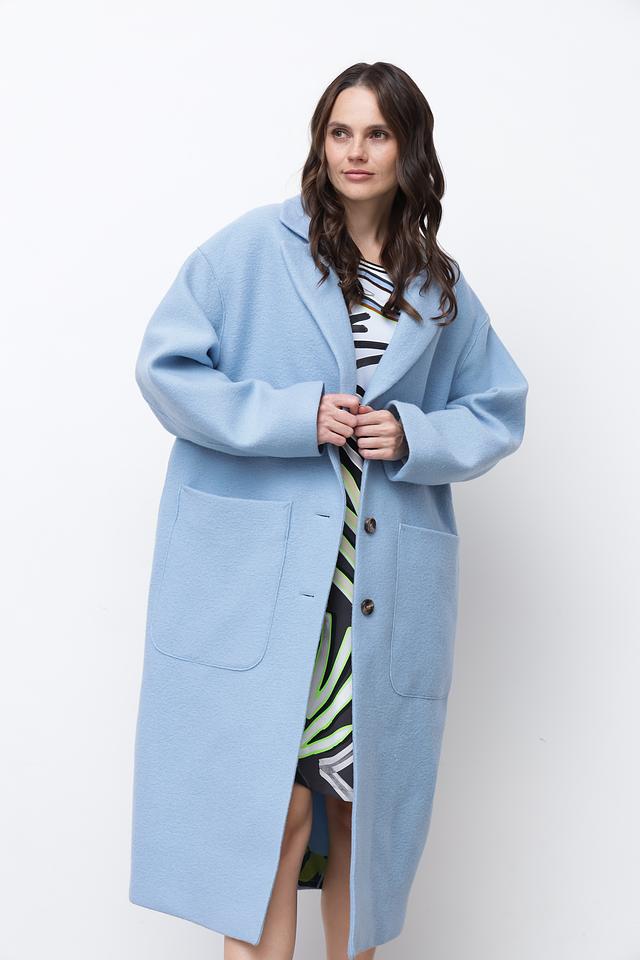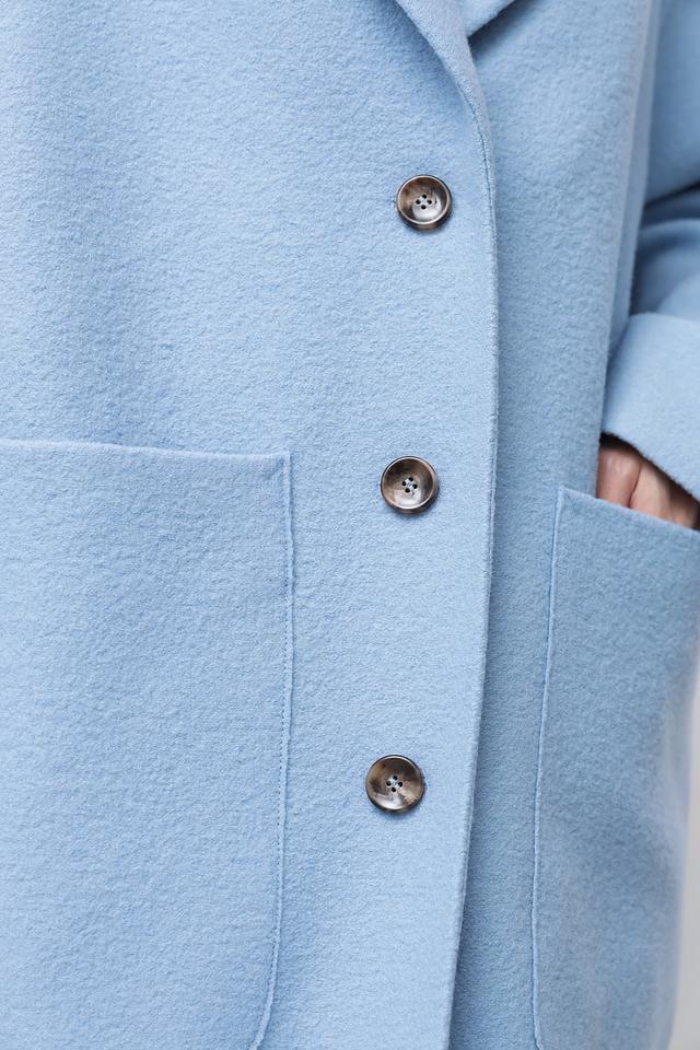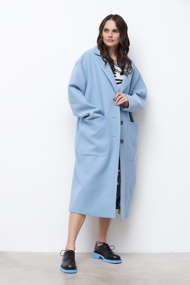 Пальто имеет два больших накладных кармана, которые не только функциональны, но и добавляют образу непринужденности. Голубой цвет придает изделию свежесть и легкость. Это пальто идеально подойдет для создания повседневных и деловых образов.