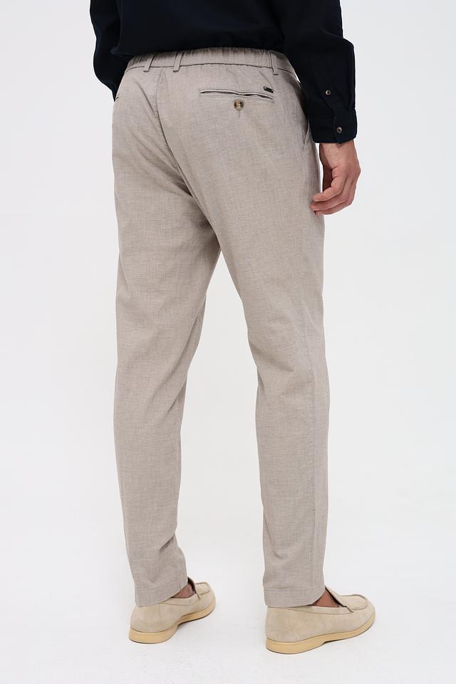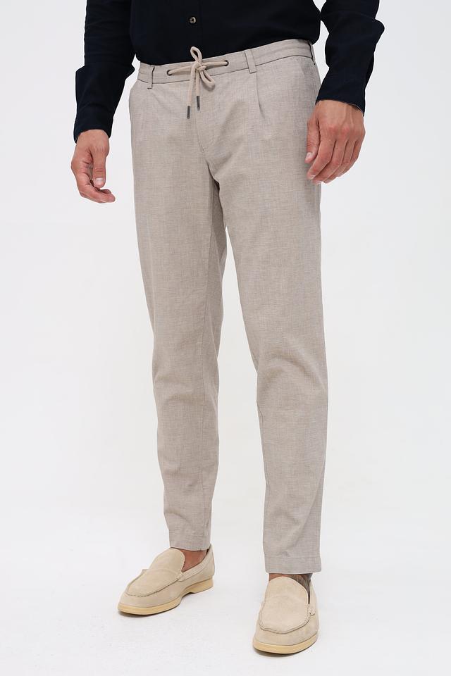 Мужские брюки Bugatti бежевого цвета с удобными завязками на поясе. Модель выполнена из смесовой ткани с добавлением хлопка и льна, что обеспечивает комфорт и воздухопроницаемость. Состав: хлопок 56%, лен 42%, эластан 2%