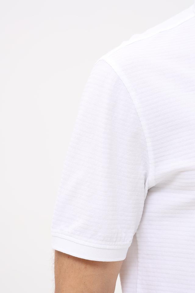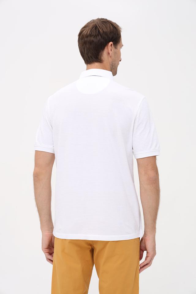 Белый цвет поло делает его универсальным элементом гардероба, который легко сочетается с различными брюками и шортами. Текстурированная поверхность ткани добавляет изысканности и оригинальности.