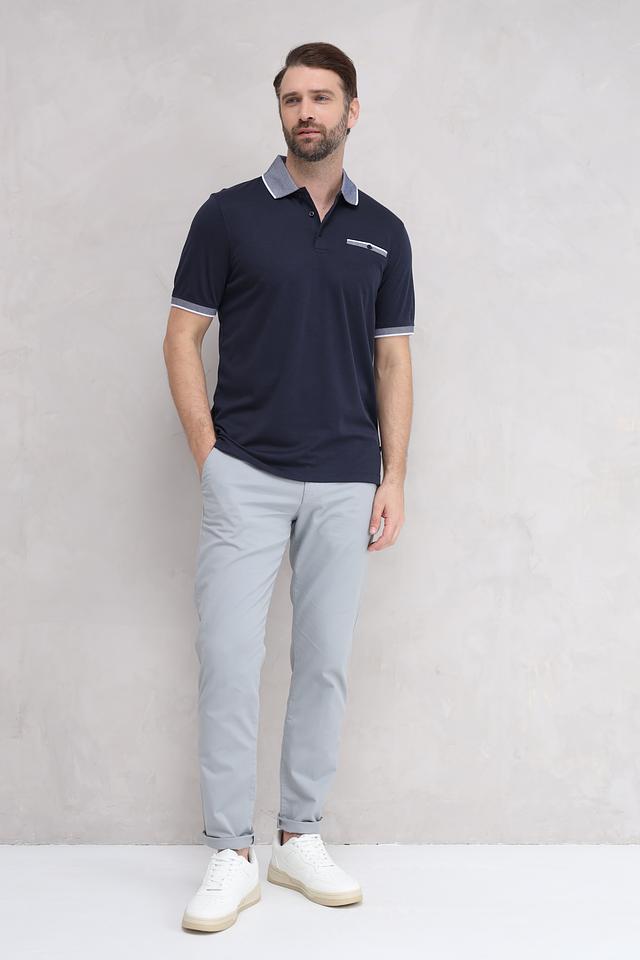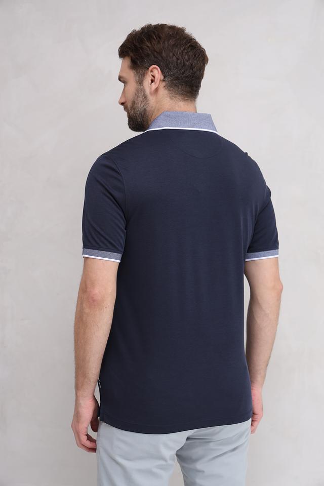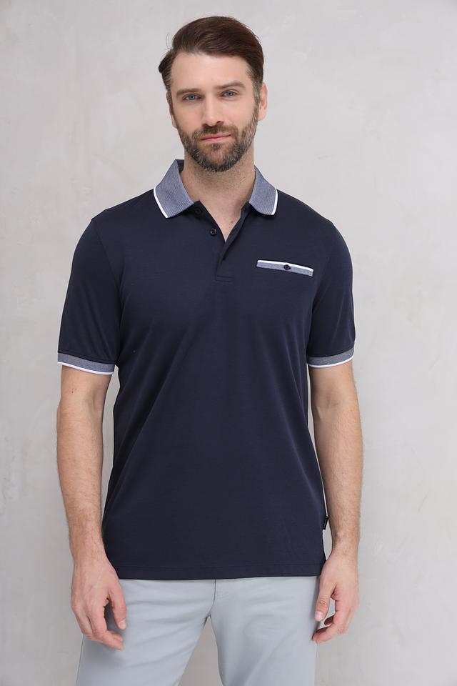 Мужское поло Bugatti темно-синего цвета с контрастным серым воротником и отделкой. Изготовлено из сочетания хлопка и полиэстера, обеспечивающего комфорт и практичность. Состав: полиэстер 50%, хлопок 50%