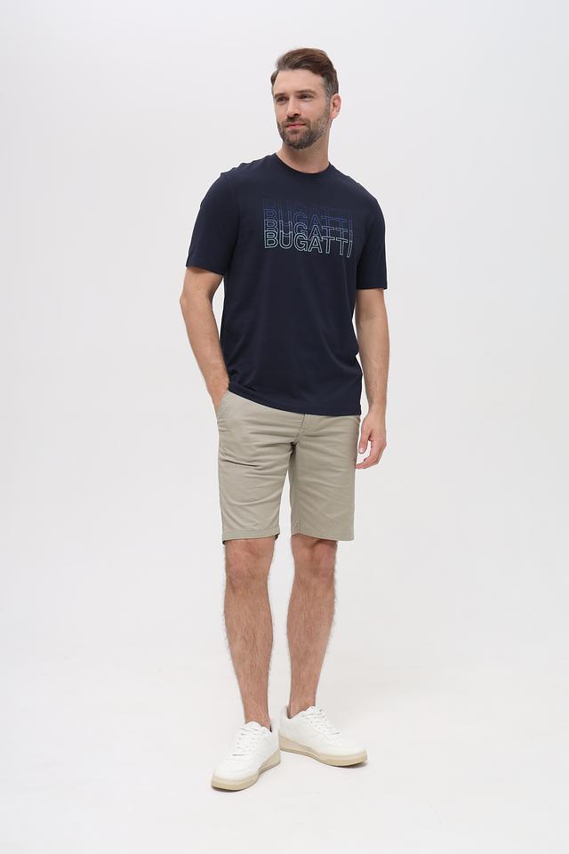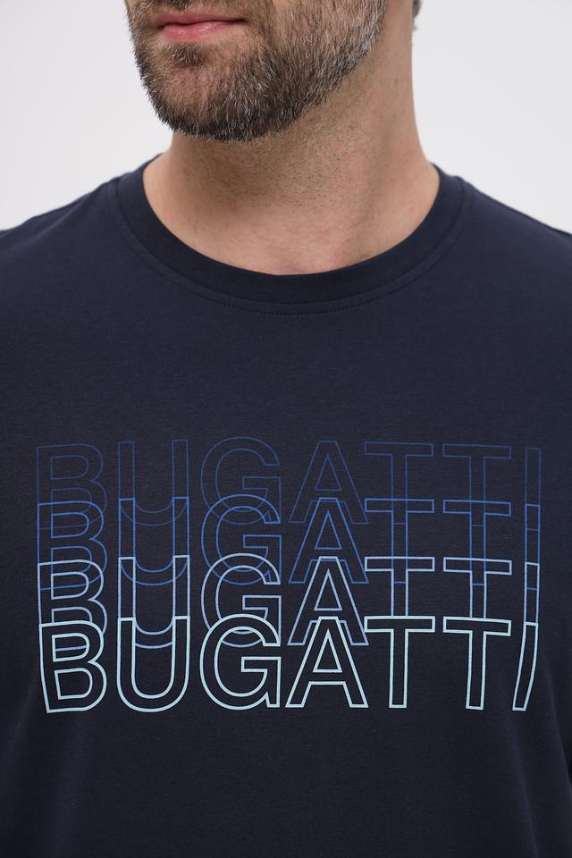 Передняя часть футболки украшена крупным, многослойным логотипом бренда Bugatti, выполненным в светло-голубом цвете. Этот элемент дизайна добавляет футболке узнаваемость и стильный акцент.