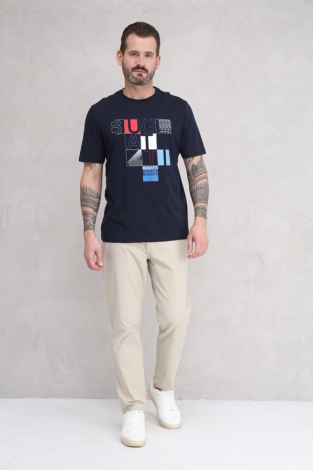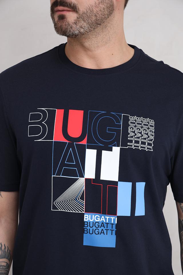 Мужская футболка Bugatti синего цвета с ярким графичным принтом логотипа бренда. Изготовлена из 100% хлопка, обеспечивающего комфорт и воздухопроницаемость. Стильный и современный дизайн. Состав: хлопок 100%