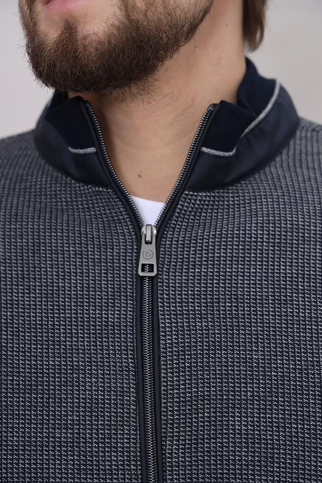 Кардиган имеет удобную застёжку-молнию, воротник-стойку с контрастной тёмно-синей отделкой, а также манжеты и нижний край из эластичной ткани тёмно-синего цвета. Сочетание полиэстера (55%) и хлопка (45%) обеспечивает комфорт в носке, практичность и долговечность изделия.