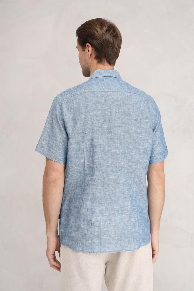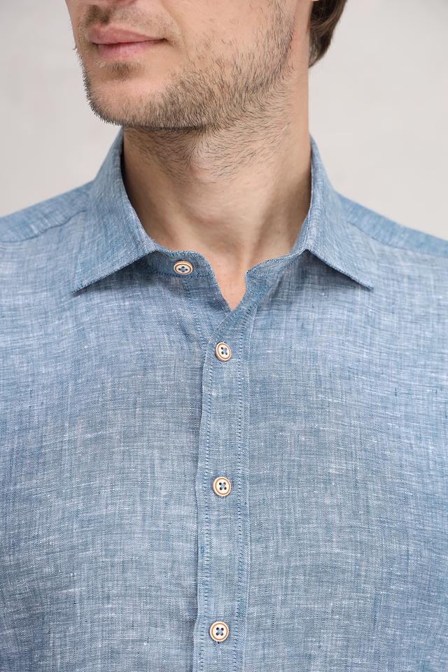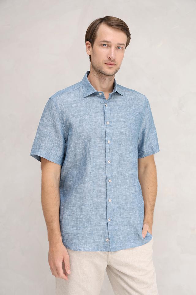 Рубашка имеет классический крой с короткими рукавами и стандартной воротником. Застёжка на пуговицы по всей длине обеспечивает удобство надевания и снятия. Текстура льна придает рубашке лёгкую небрежность и элегантность.