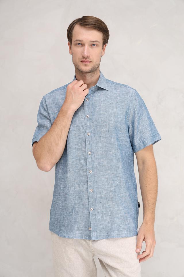 Мужская рубашка Bugatti голубого цвета с коротким рукавом выполнена из 100% льна. Лёгкая и дышащая модель идеально подходит для летнего гардероба. Рубашка отличается стильным дизайном и высоким качеством исполнения. Состав: лен 100%