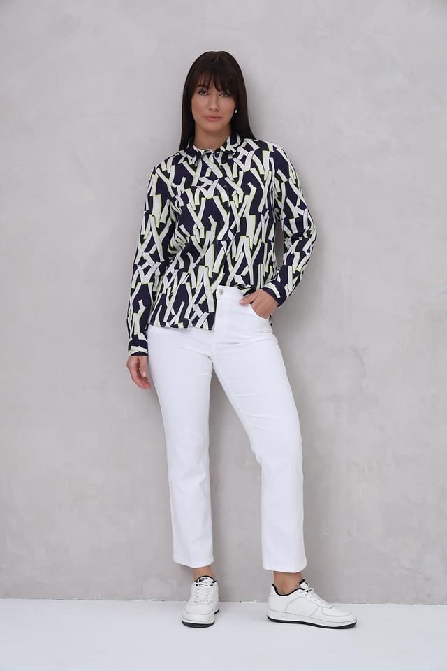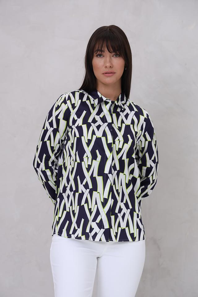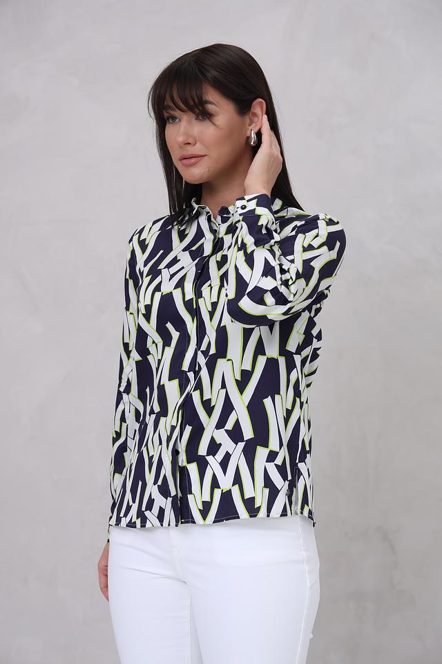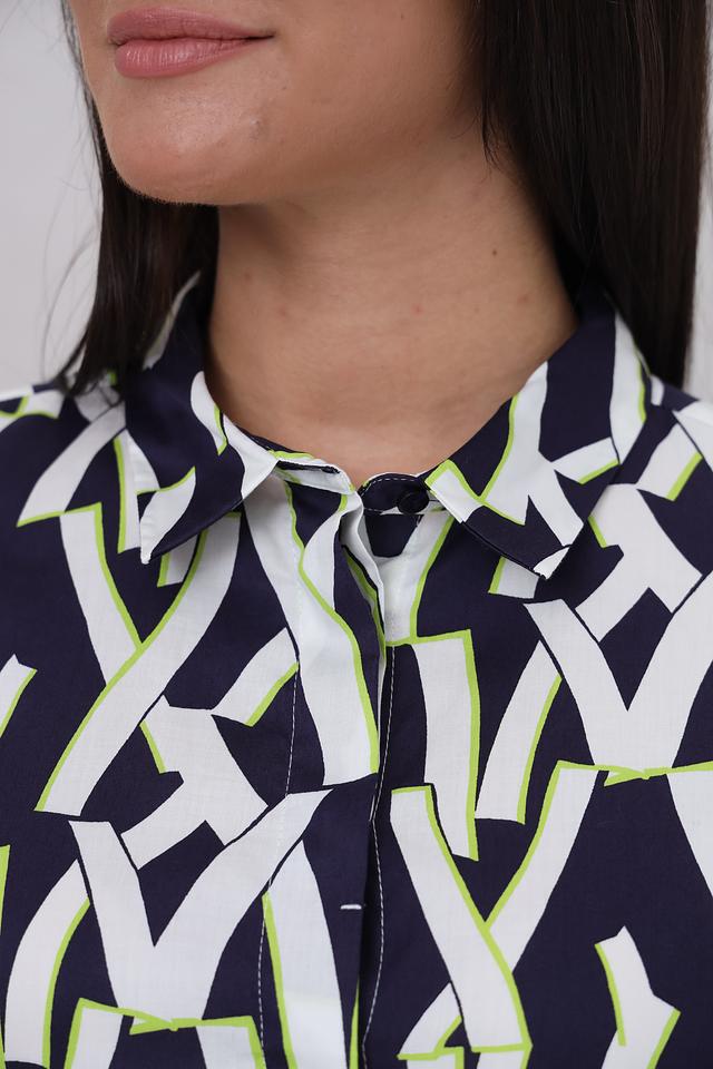 Рубашка имеет длинный рукав и классический крой, который подходит для различных типов фигур. Особенностью модели является яркий геометрический принт, сочетающий в себе оттенки синего, белого и лайма. Принт придает рубашке современный и динамичный вид.