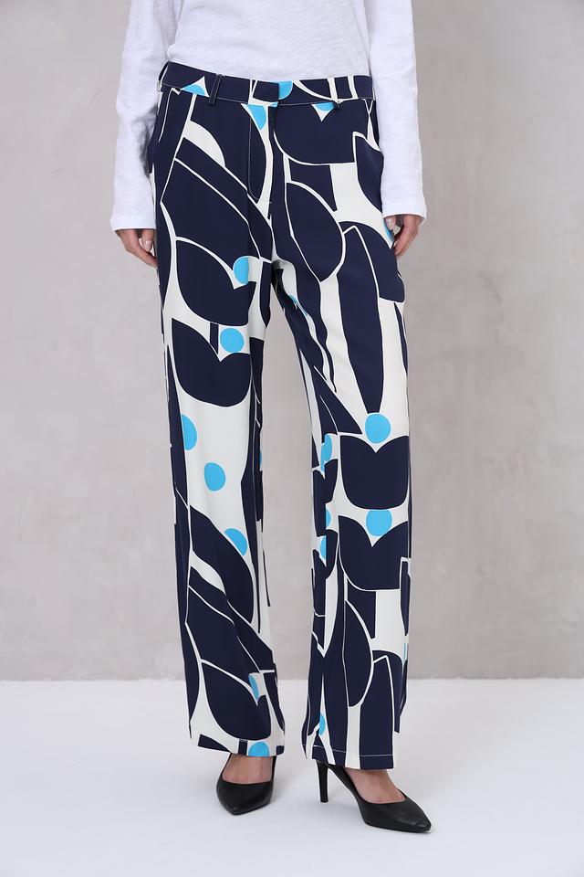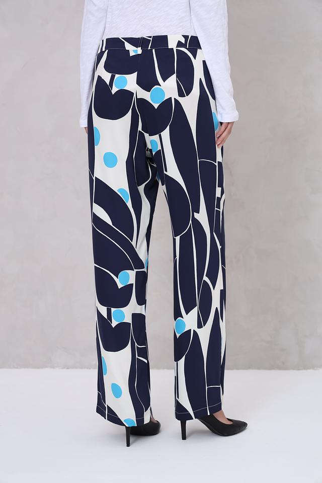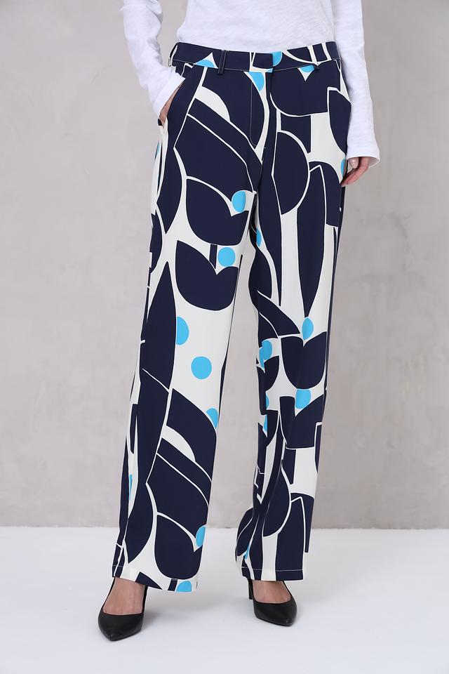 Особенностью модели является яркий и необычный геометрический принт, сочетающий в себе оттенки синего, белого и голубого. Прямой крой брюк подходит для любого типа фигуры и позволяет создавать различные комбинации с другой одеждой.