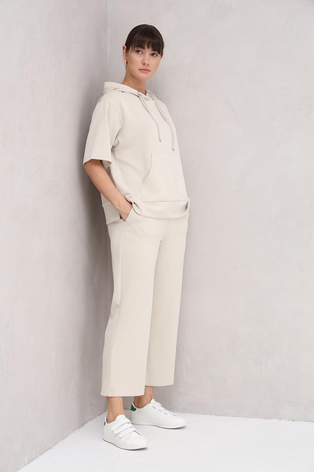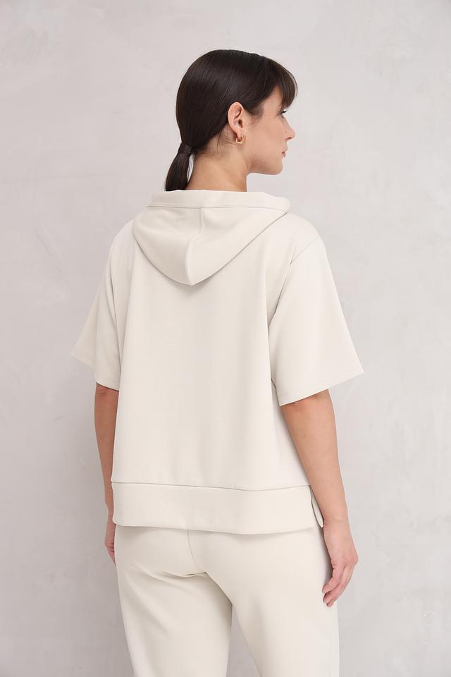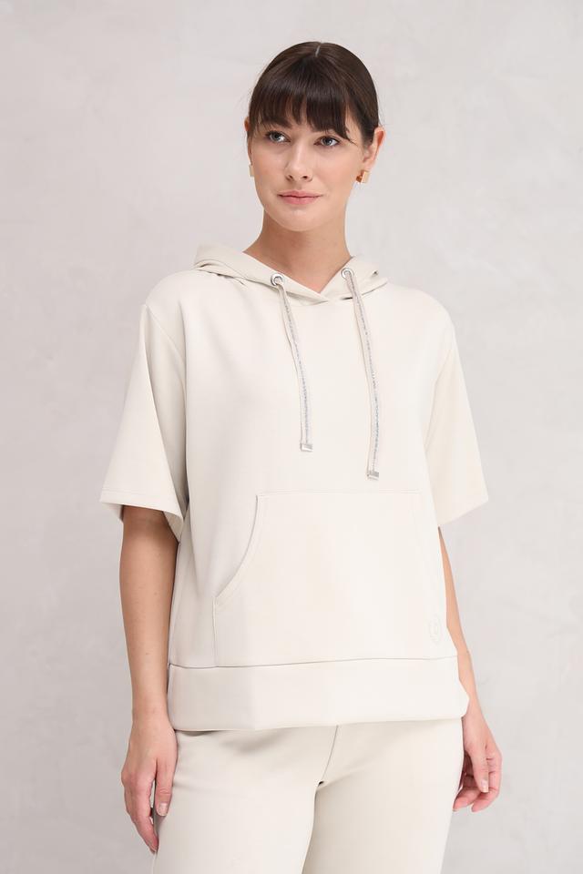 Бежевый пуловер Bugatti с короткими рукавами и капюшоном на шнурках – стильное и комфортное решение для повседневного образа. Модель выполнена из мягкого и приятного к телу трикотажа, обеспечивающего удобную посадку. Состав: модал 65%, полиэстер 30%, эластан 5%