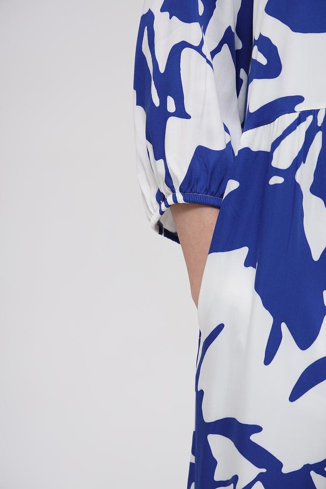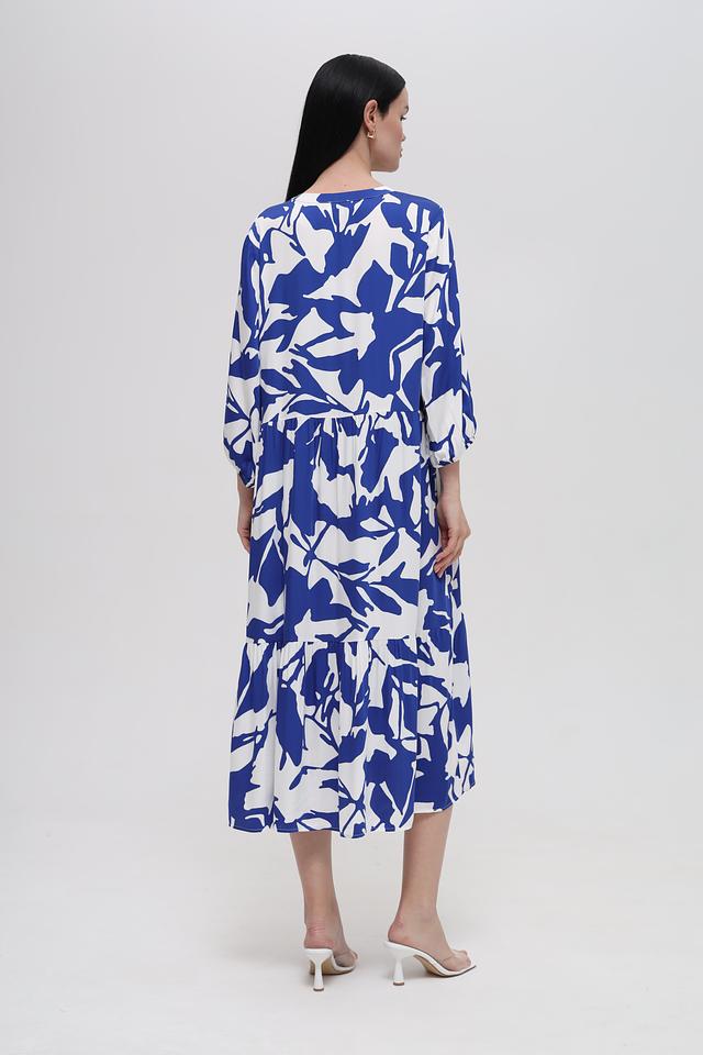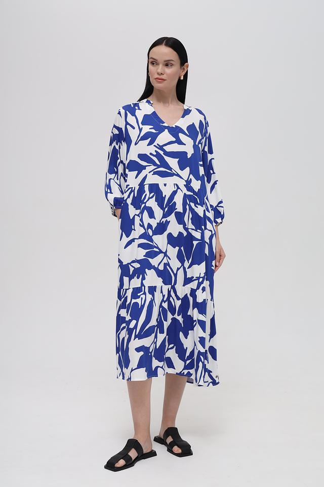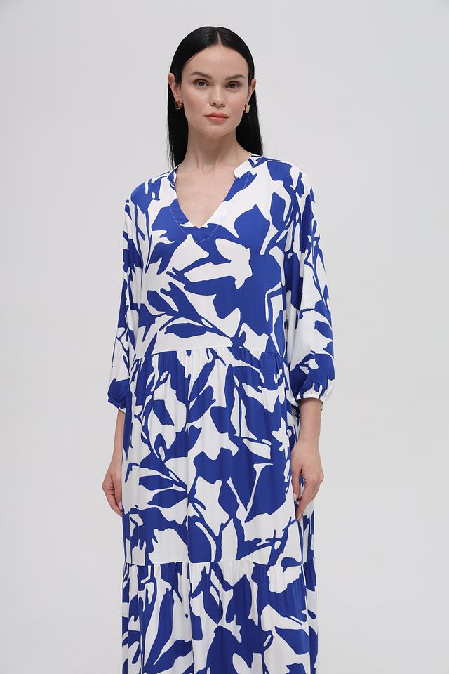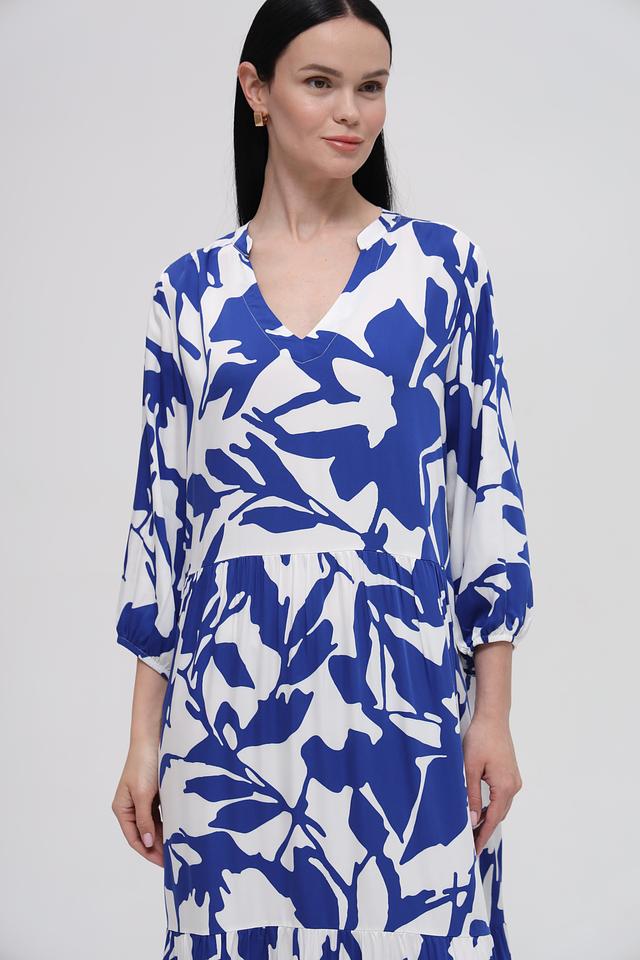 Платье имеет свободный крой, который не сковывает движений и позволяет коже дышать. V-образный вырез горловины и рукава 3/4 придают модели элегантность и женственность. Яркий цветочный принт добавляет образу игривости и свежести.