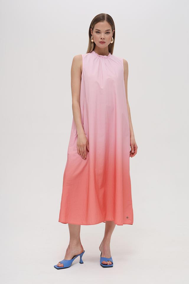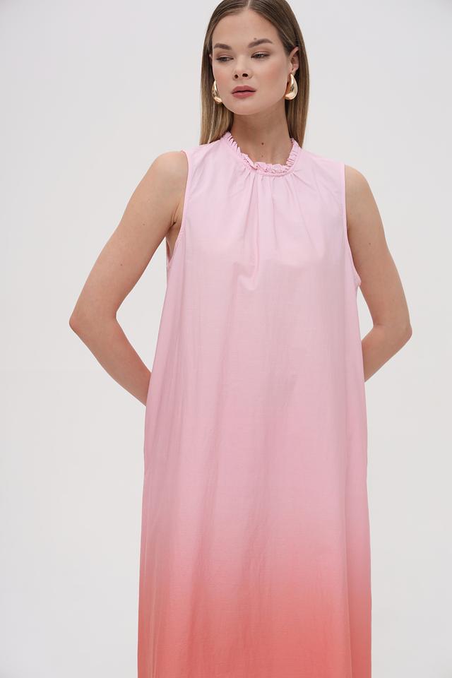 Платье имеет прямой, слегка свободный крой, который не сковывает движений. Особое внимание привлекает градиентный переход цвета от нежно-розового в верхней части к персиковому в нижней. Вырез горловины оформлен небольшим воланом, добавляющим образу женственности.