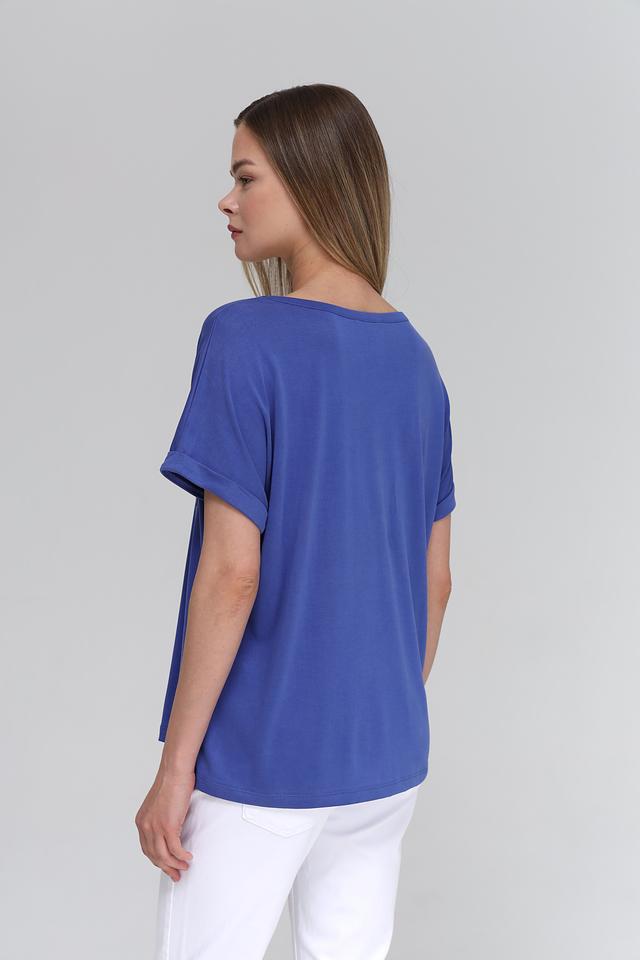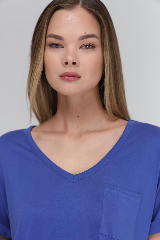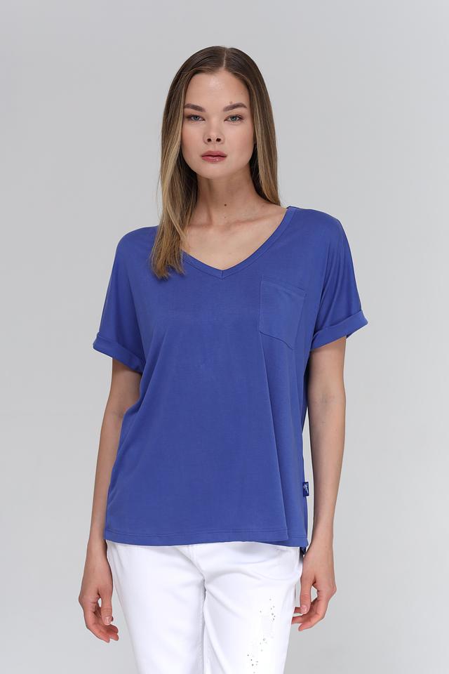 Футболка имеет V-образный вырез горловины, который визуально удлиняет шею и делает образ более женственным. Короткие рукава с небольшим подворотом придают футболке непринужденный и современный вид. На груди расположена накладная карман, который добавляет функциональности и оригинальности.