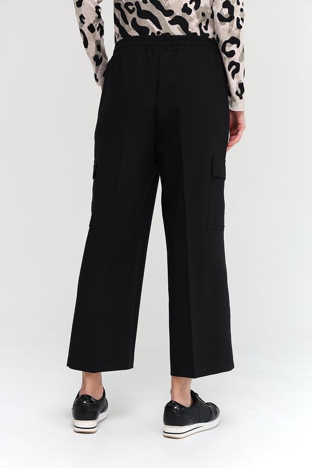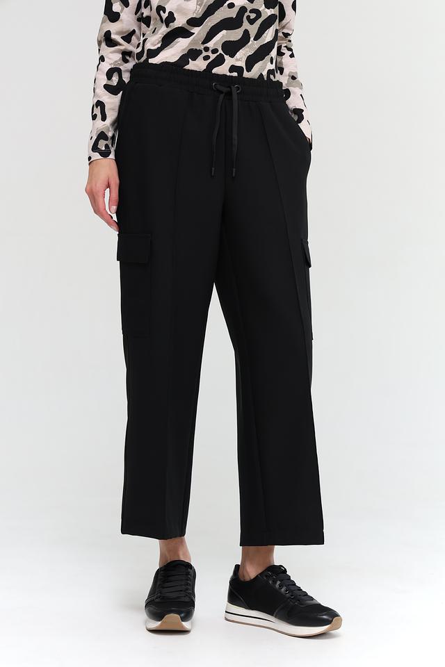 Брюки имеют прямой крой и стандартную посадку по фигуре. Отличительной особенностью являются функциональные боковые карманы-патрубки, добавляющие образу динамичности. Застежка на молнию и пуговицу, а также эластичный пояс с кулиской обеспечивают удобную и надежную фиксацию.