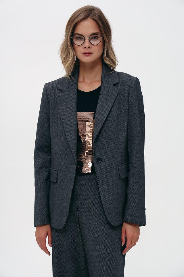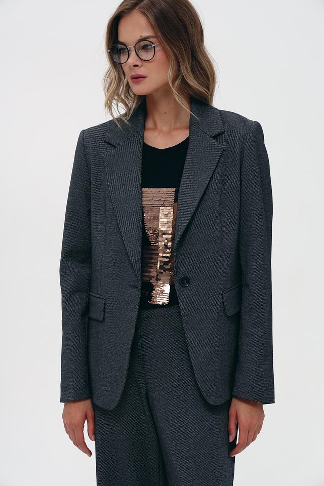 Жакет имеет классический крой с лацканами, однобортную застежку на пуговицу и функциональные карманы. Состав ткани включает полиэстер, хлопок и эластан, что обеспечивает приятные тактильные ощущения, хорошую посадку по фигуре и устойчивость к сминанию.