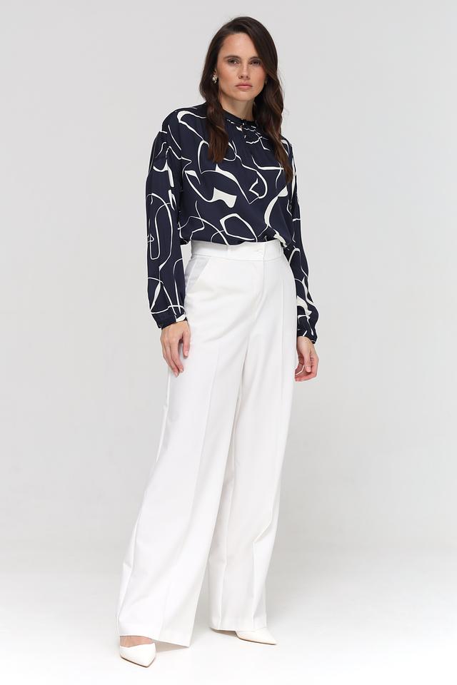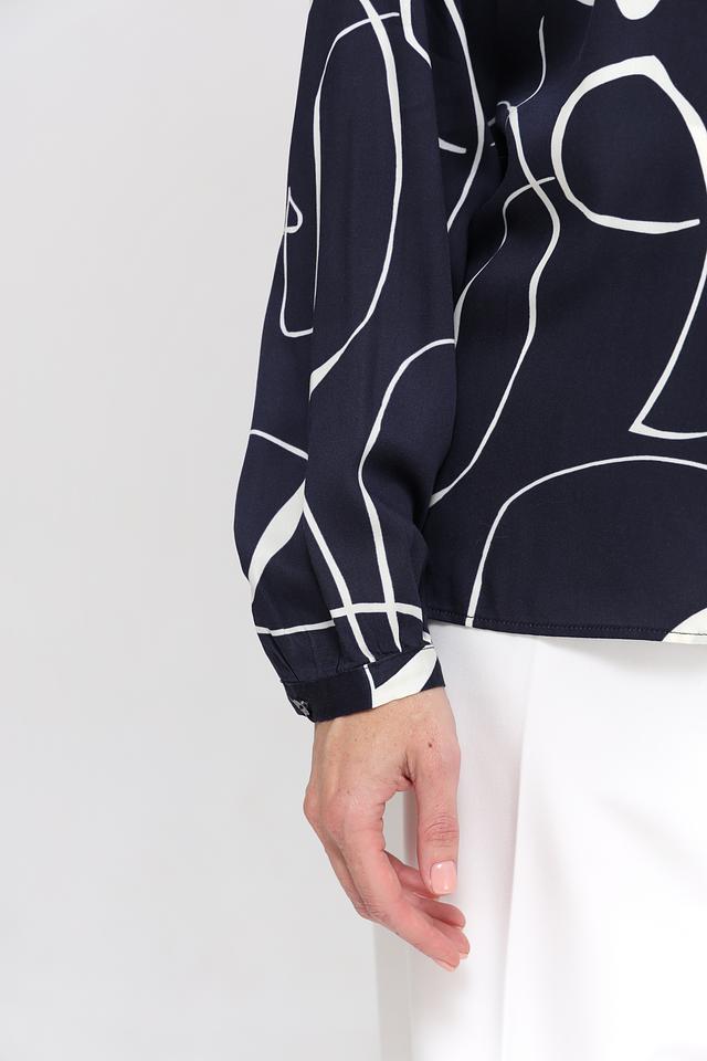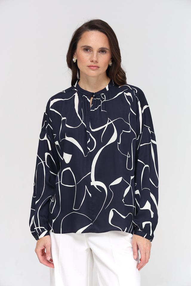 Блуза имеет свободный крой, который не сковывает движения, и рукава-фонарики, придающие образу романтичность и легкость. Особенностью модели является оригинальный абстрактный рисунок в белоснежных тонах на темно-синем фоне, который делает ее уникальной и привлекательной.