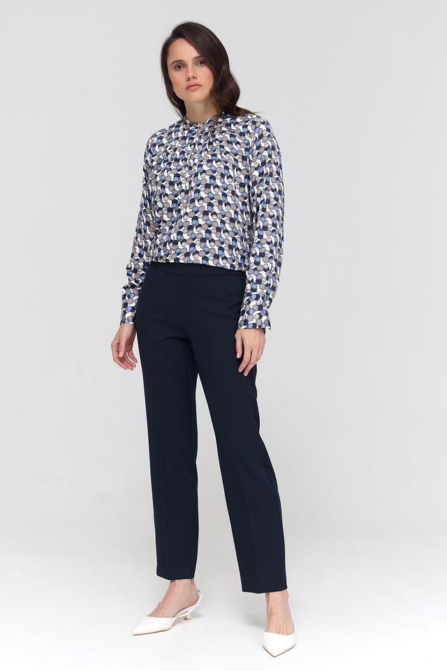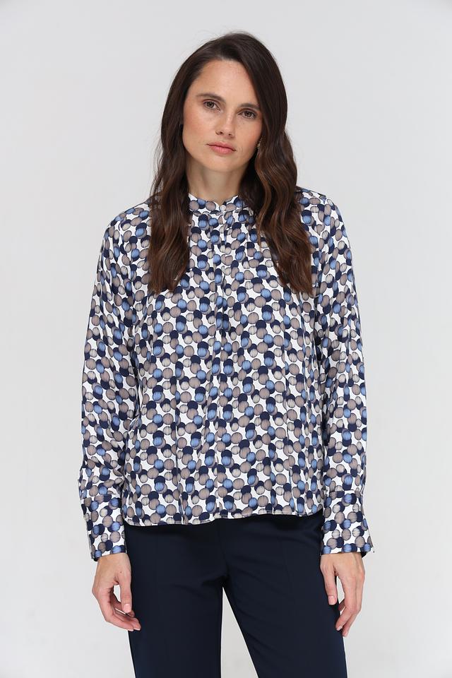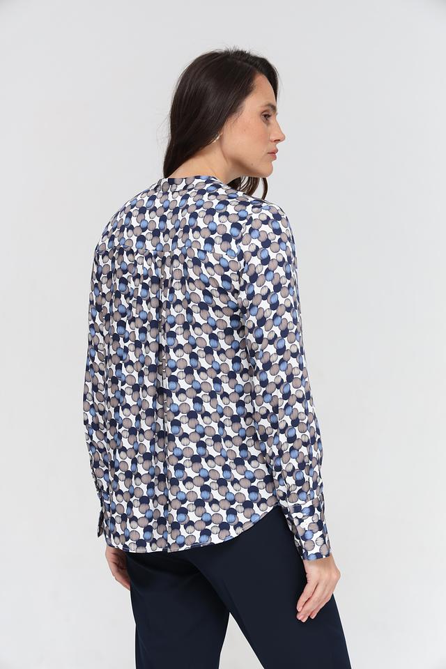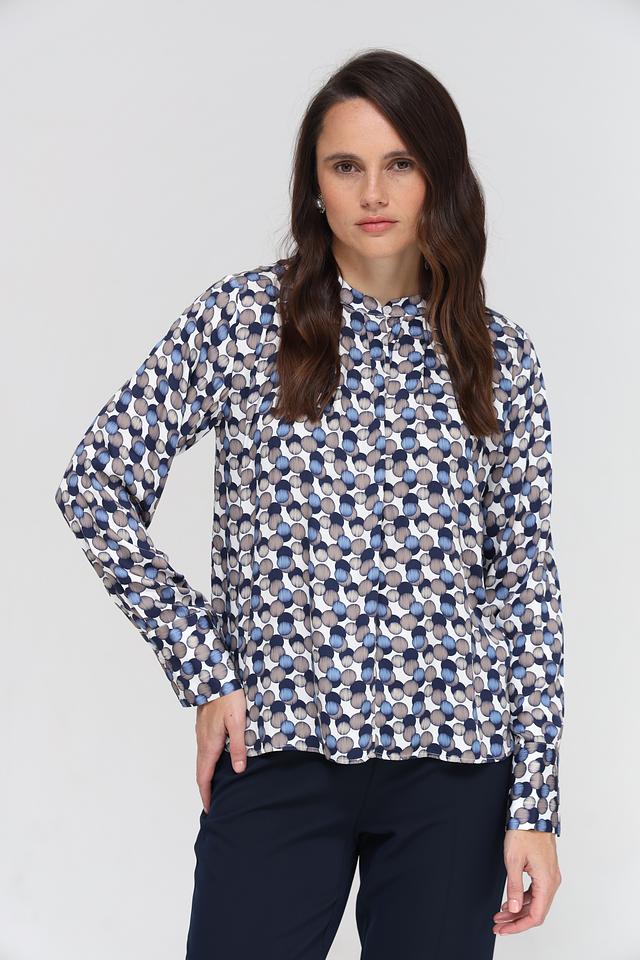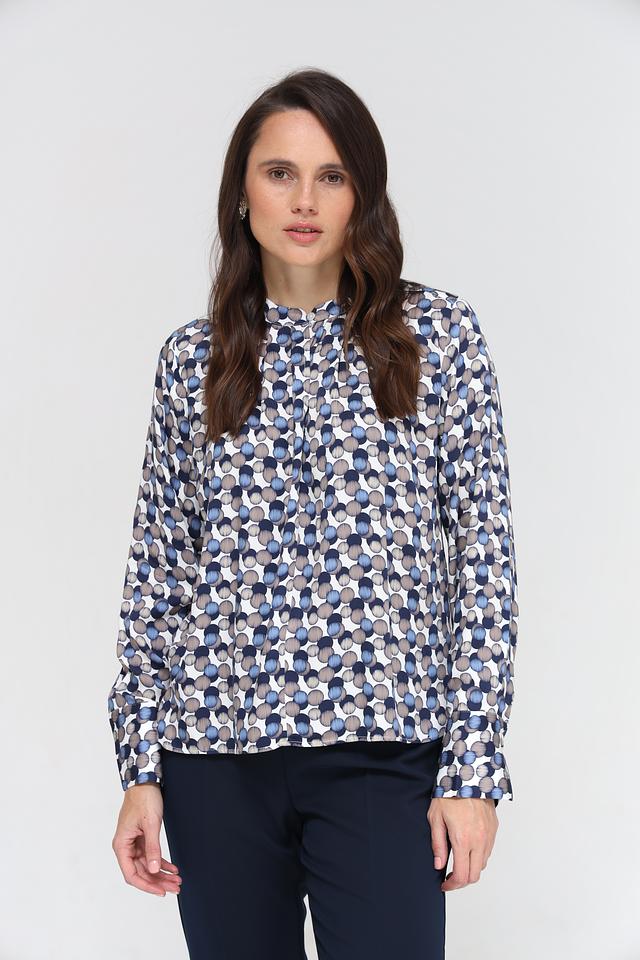 Блуза имеет длинные рукава и классический крой, который подойдет для создания различных образов – от деловых до повседневных. Особенностью модели является яркий геометрический принт, состоящий из округлых элементов синих и серых оттенков на белом фоне.