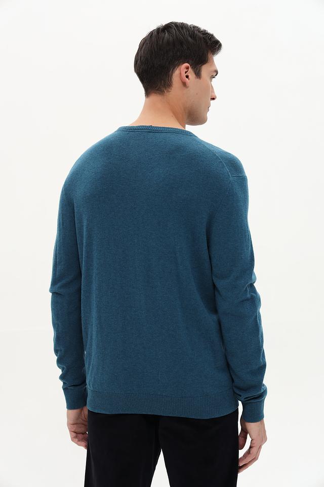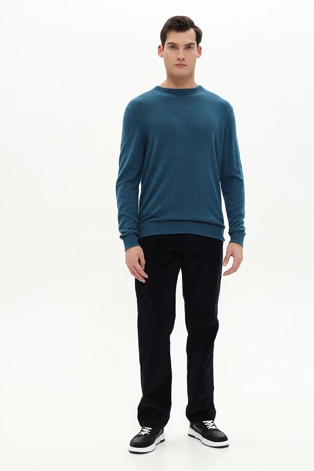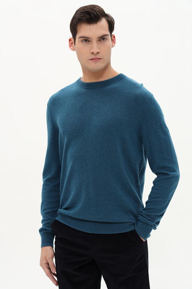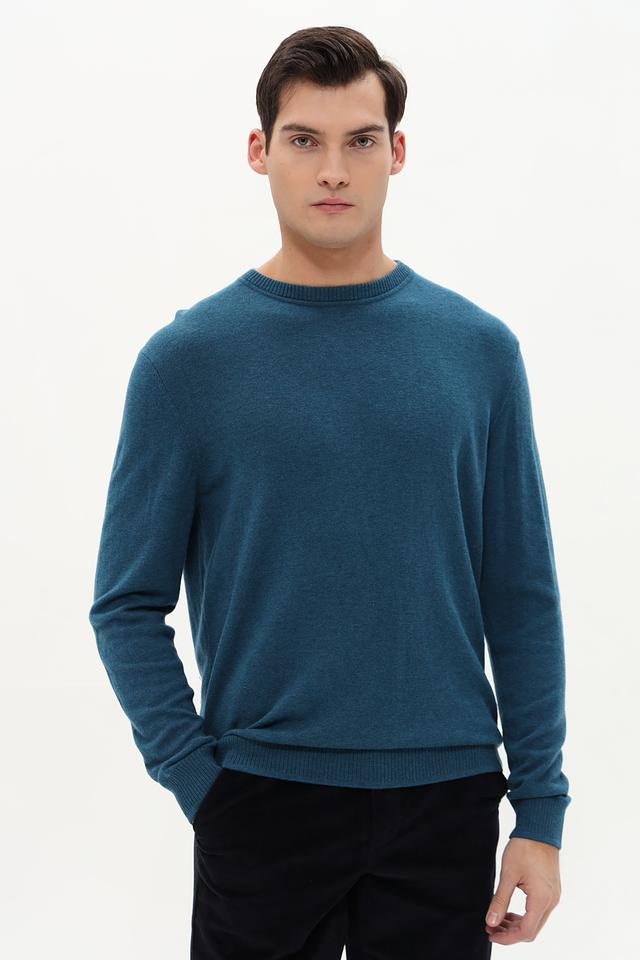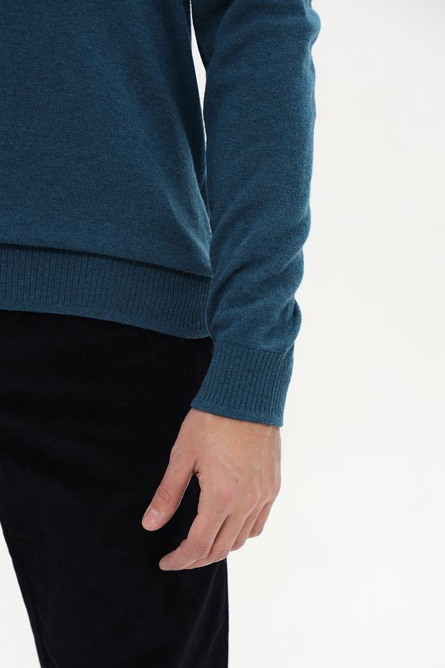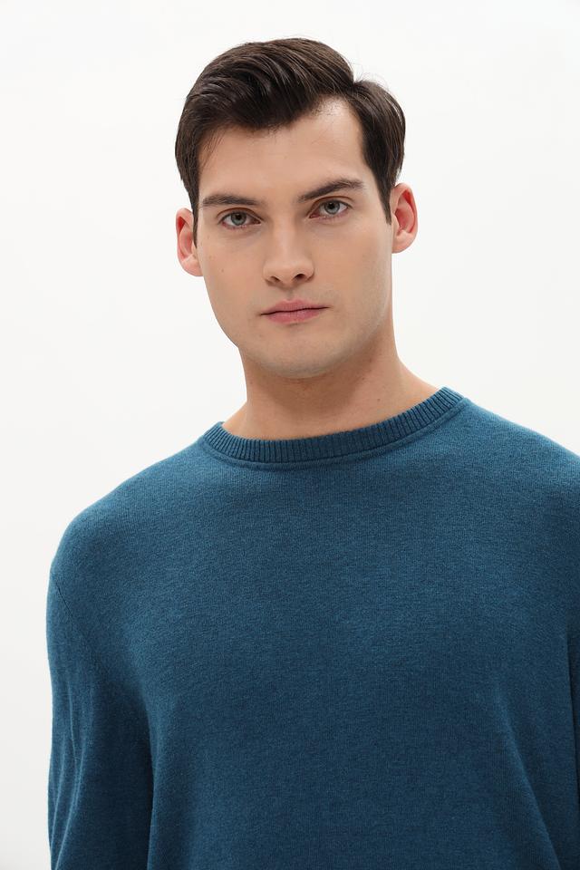 Джемпер имеет классический крой и круглый вырез горловины. Цвет – насыщенный бирюзовый, который отлично подойдет для создания различных образов. Текстура вязки слегка фактурная, что придает изделию дополнительный объем и визуальный интерес.
