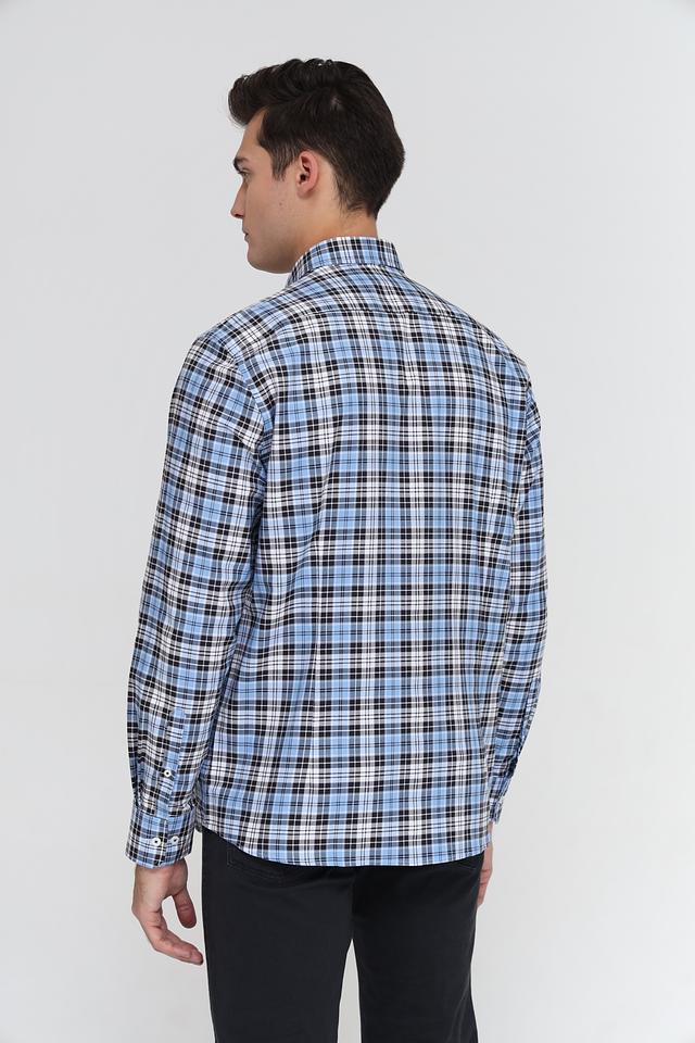 Рубашка выполнена в классическом крое с длинными рукавами и традиционным воротником. Особенностью модели является клетчатый рисунок, сочетающий в себе голубые, белые и черные оттенки. На груди расположена небольшая эмблема бренда Bugatti.