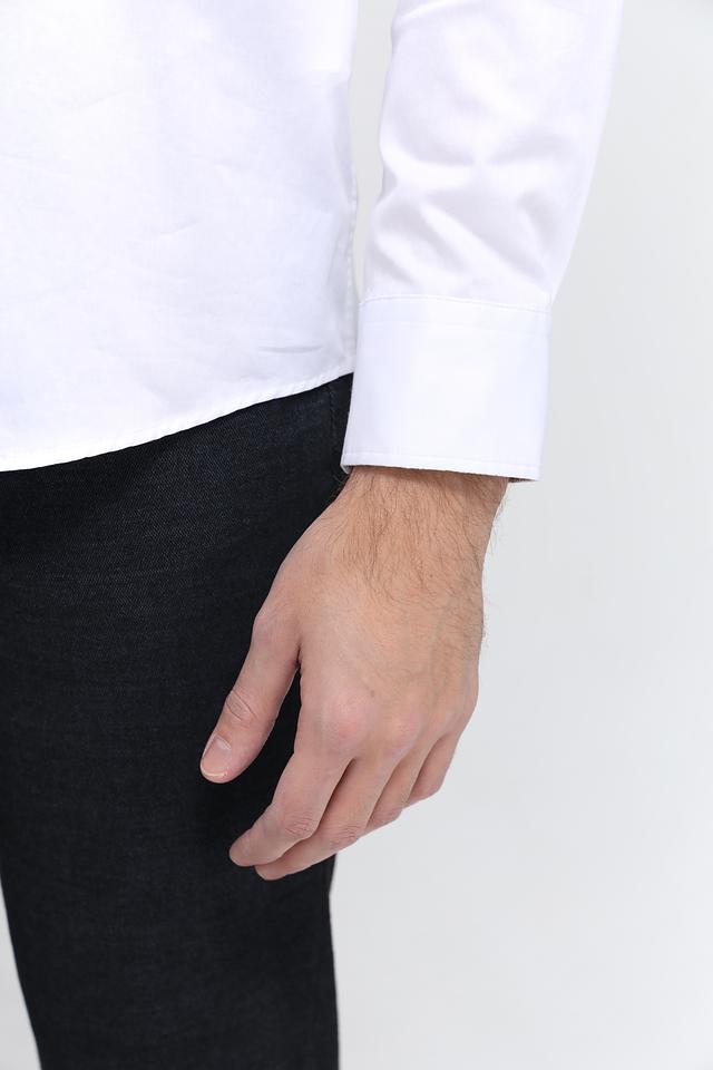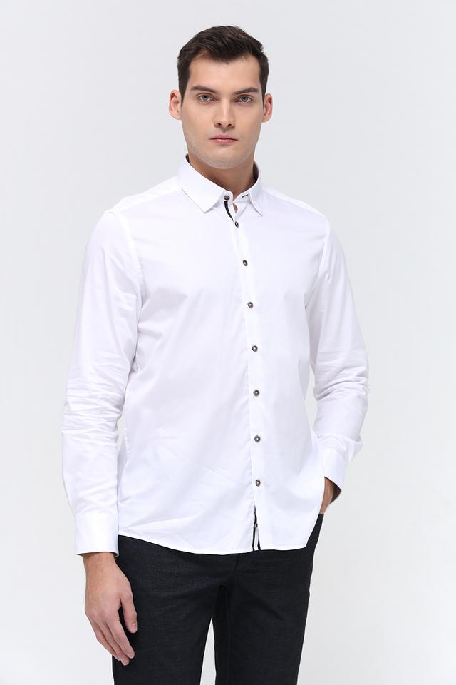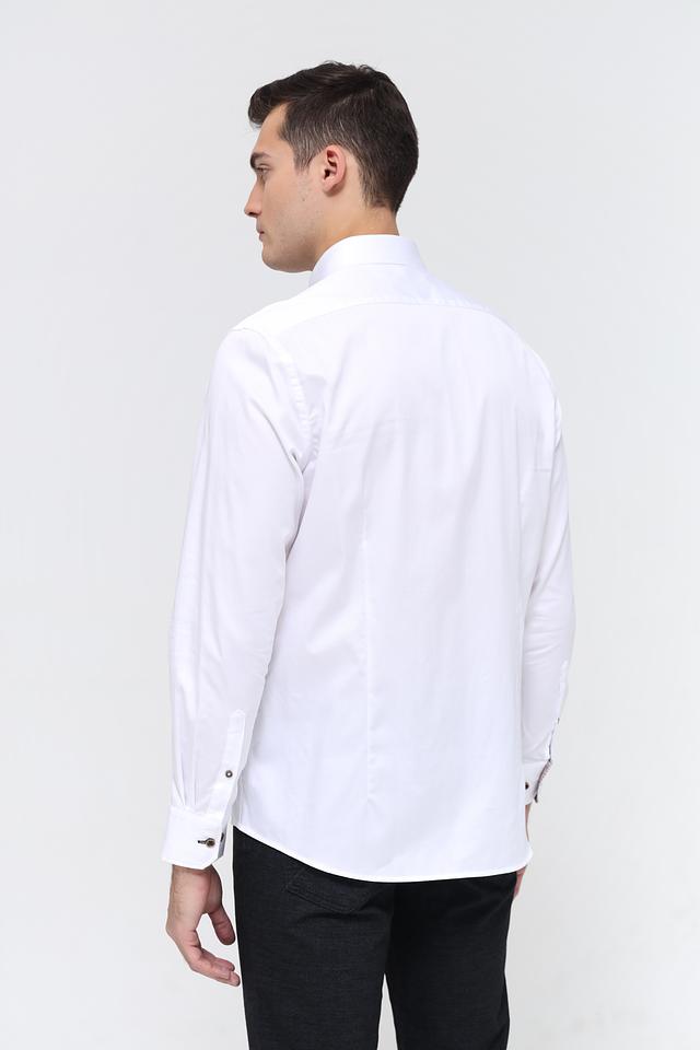 Рубашка имеет прямой, приталенный крой Slim Fit, который подчеркивает достоинства фигуры. Застежка на пуговицы, манжеты на пуговицах и классический отложной воротник добавляют рубашке элегантности и стиля.