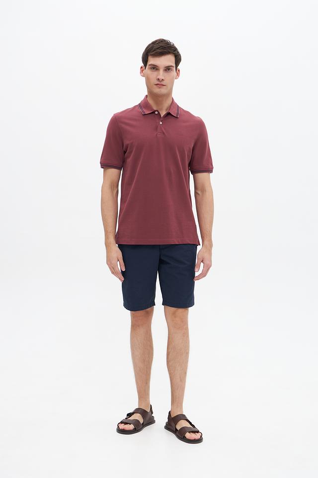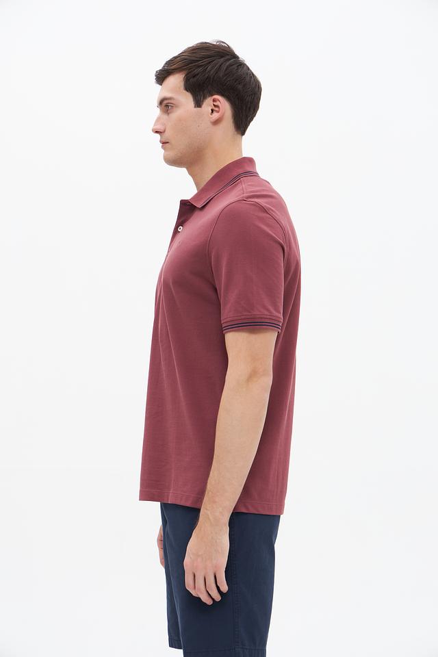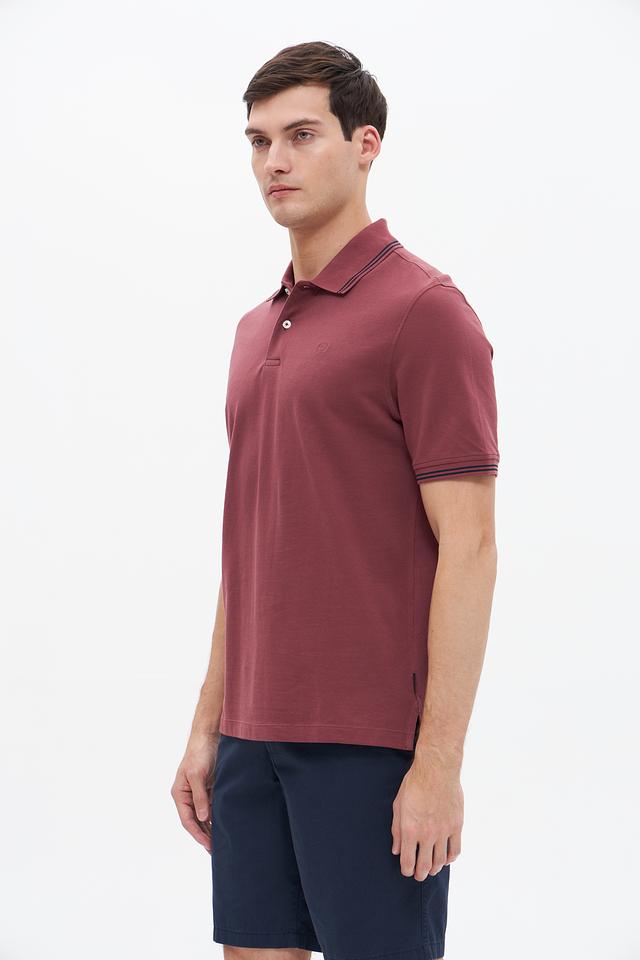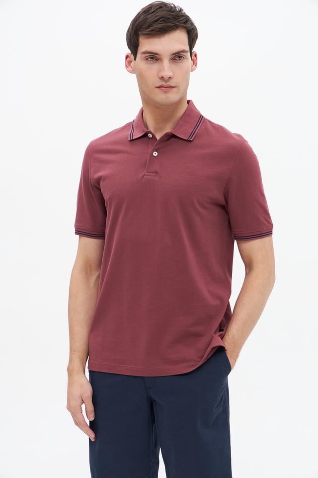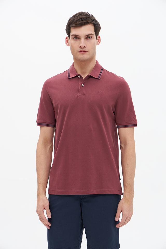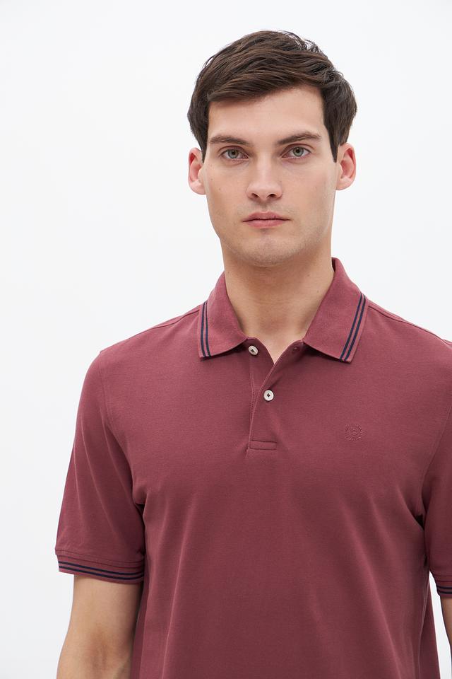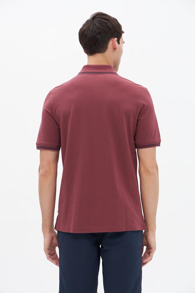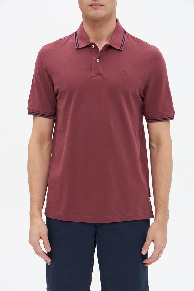 Мужское поло Bugatti бордового цвета с контрастной полоской на воротнике и рукавах. Изготовлено из 100% хлопка, обеспечивающего комфорт и воздухопроницаемость. Стильный и универсальный вариант для повседневного образа. Состав: хлопок 100%