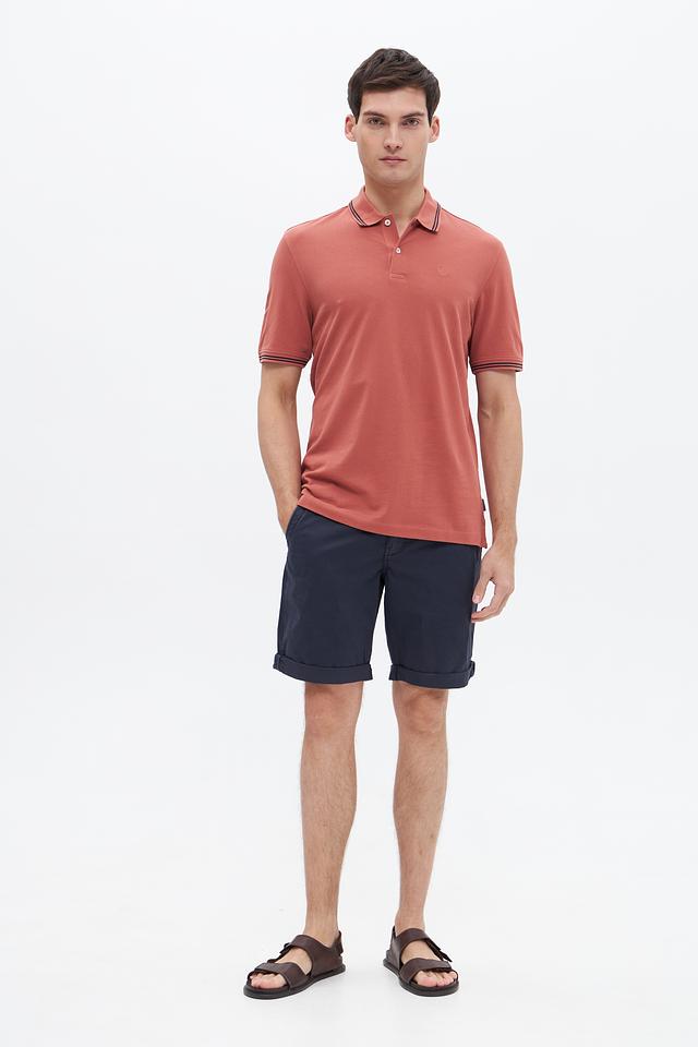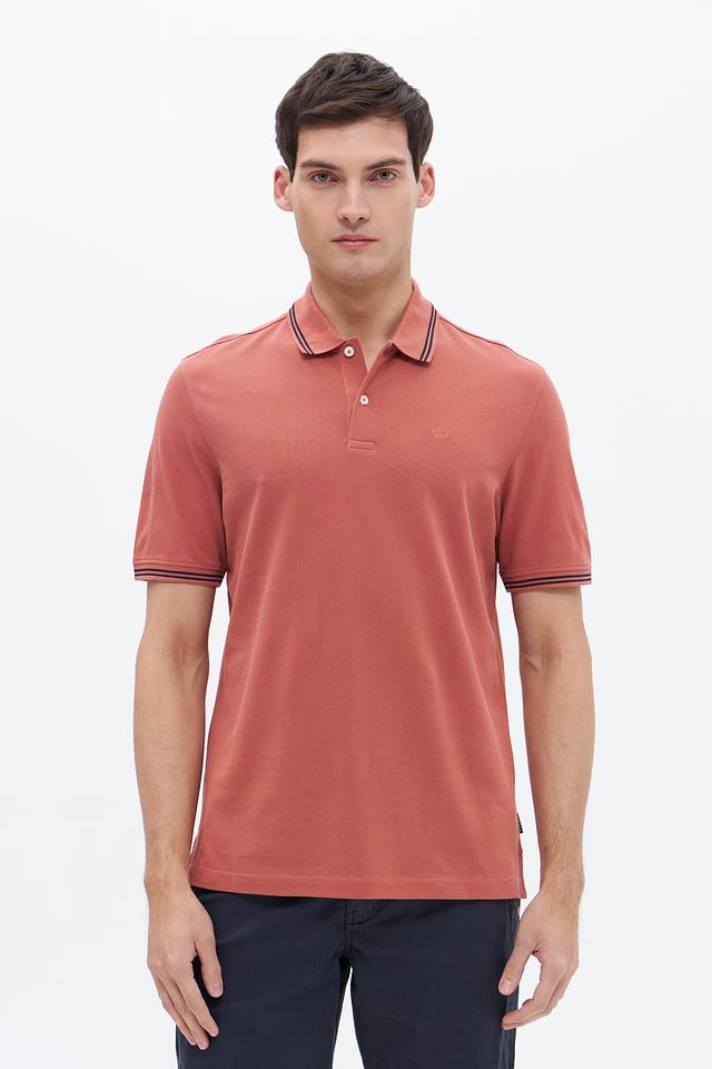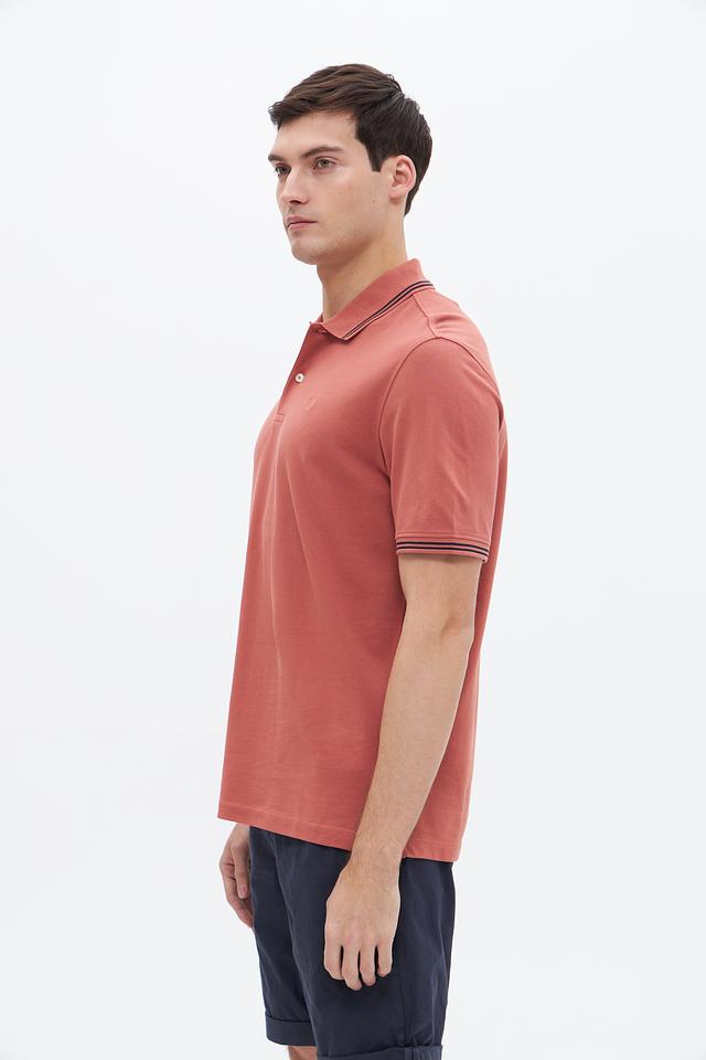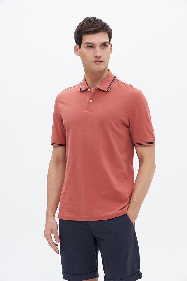 Модель имеет классический крой, короткие рукава и воротник-поло с контрастной окантовкой в тонкую полоску. Цвет поло – терракотовый, спокойный и универсальный, легко сочетается с различными элементами гардероба.