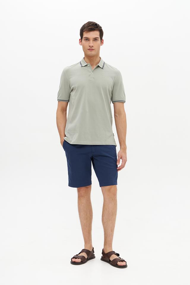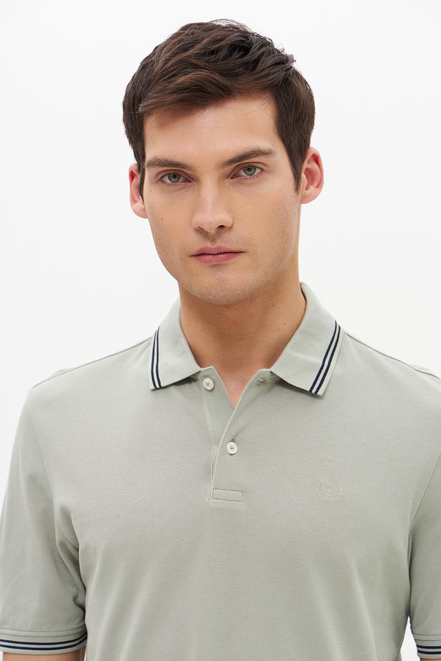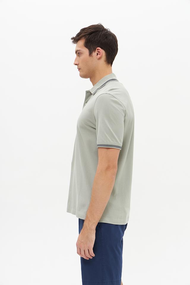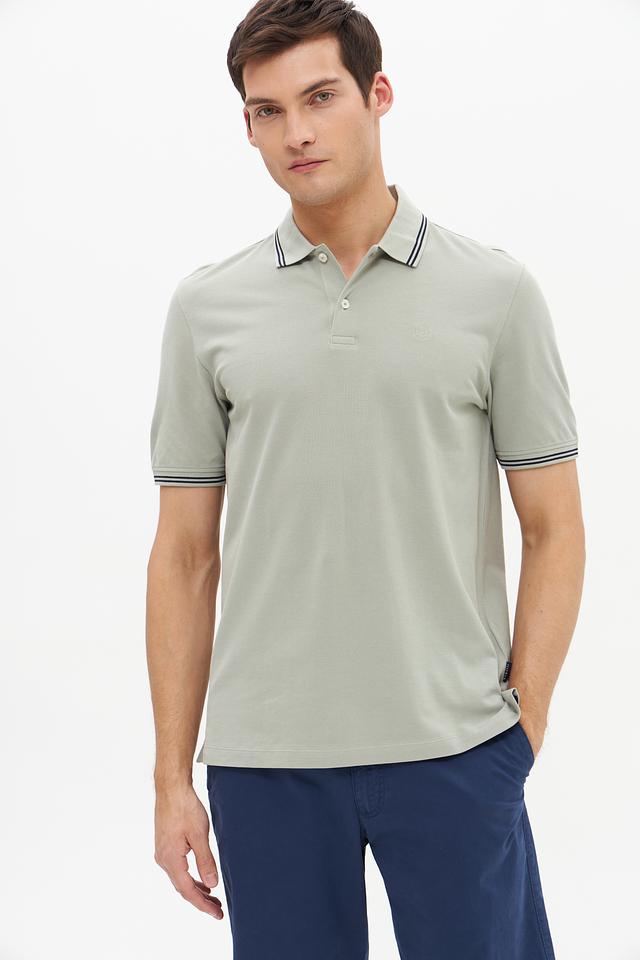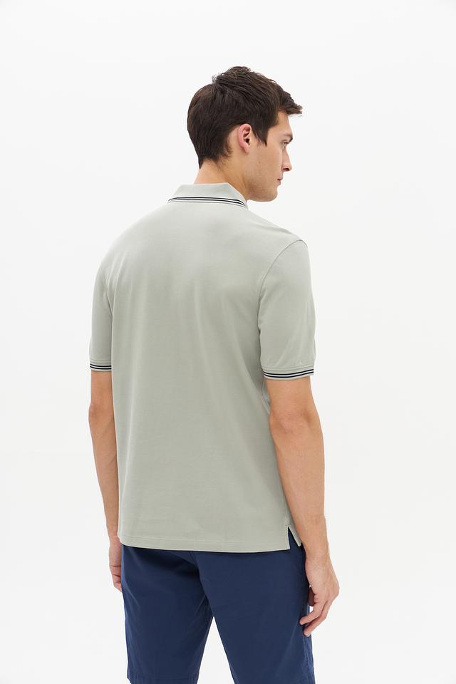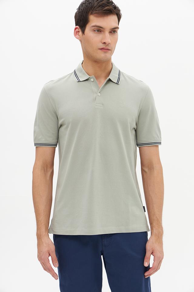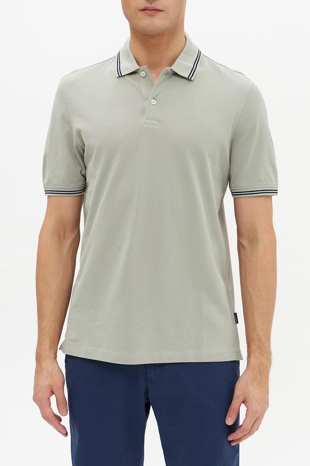 Воротник и короткие рукава поло оформлены контрастной полоской, добавляющей изделию стильный акцент. Поло застегивается на планку с пуговицами. Ткань поло состоит из 100% хлопка, что делает его приятным к телу и обеспечивает хорошую воздухопроницаемость.