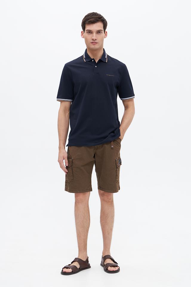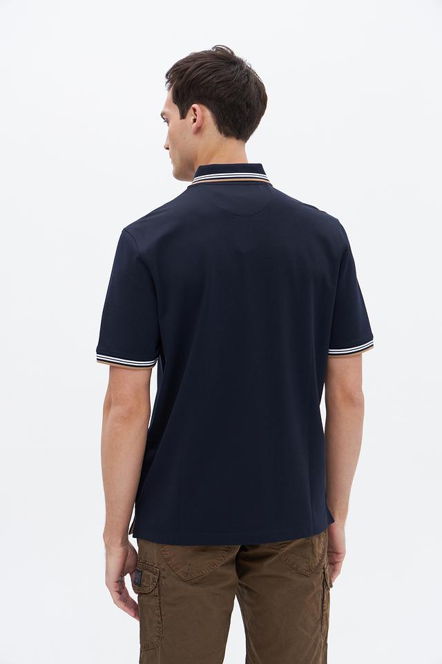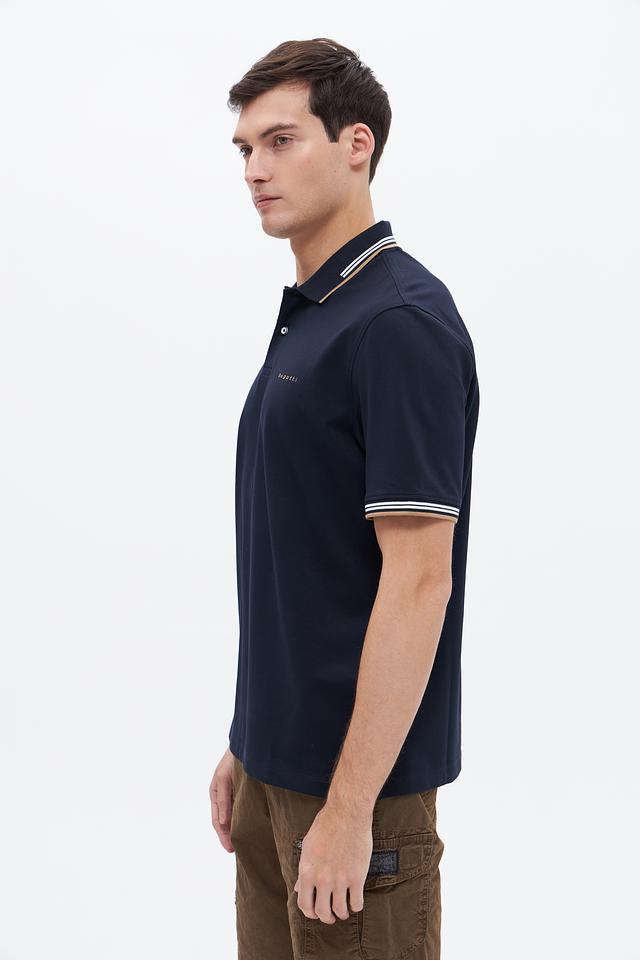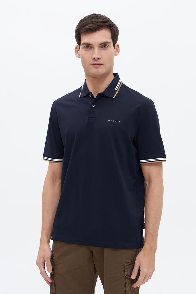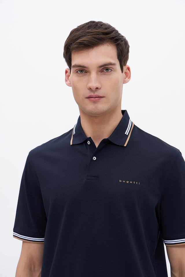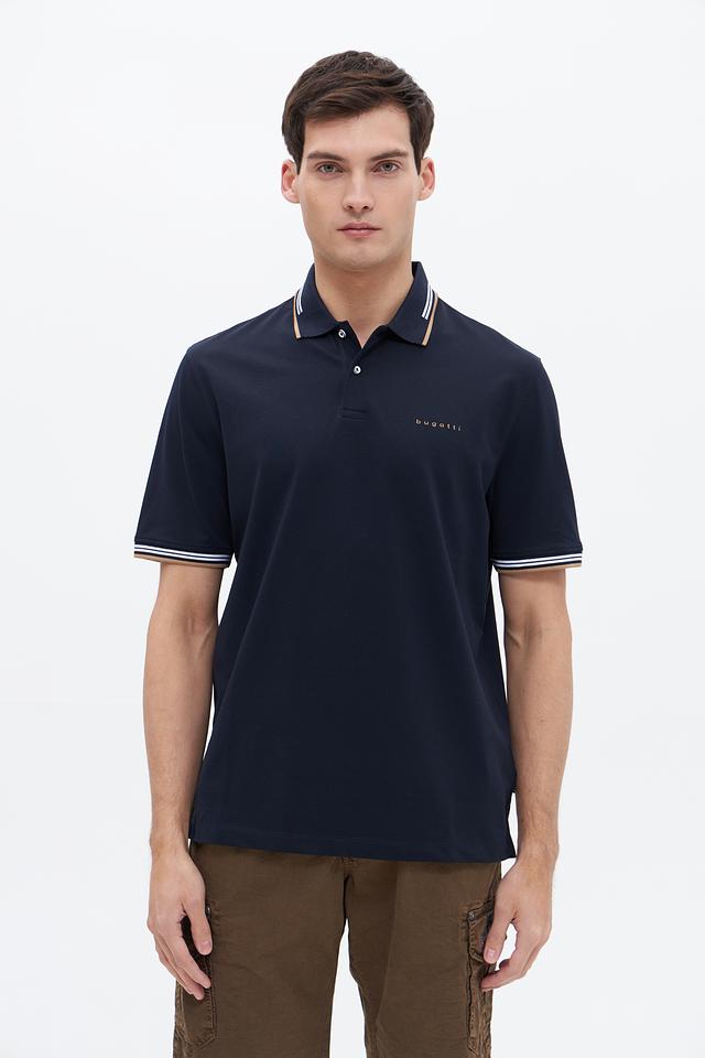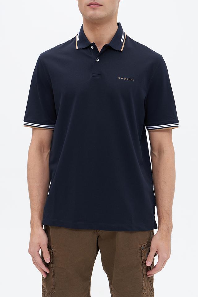 Мужское поло Bugatti темно-синего цвета с контрастной полоской на воротнике и рукавах. Изготовлено из комфортного сочетания хлопка, полиэстера и эластана, обеспечивающего удобную посадку и практичность. Состав: хлопок 52%, полиэстер 44%, эластан 4%