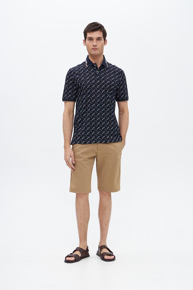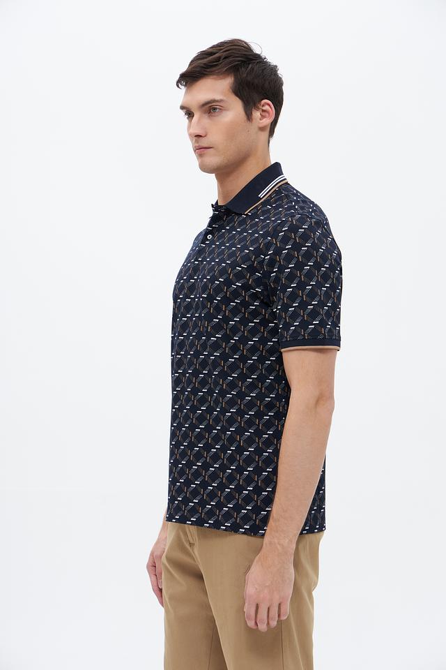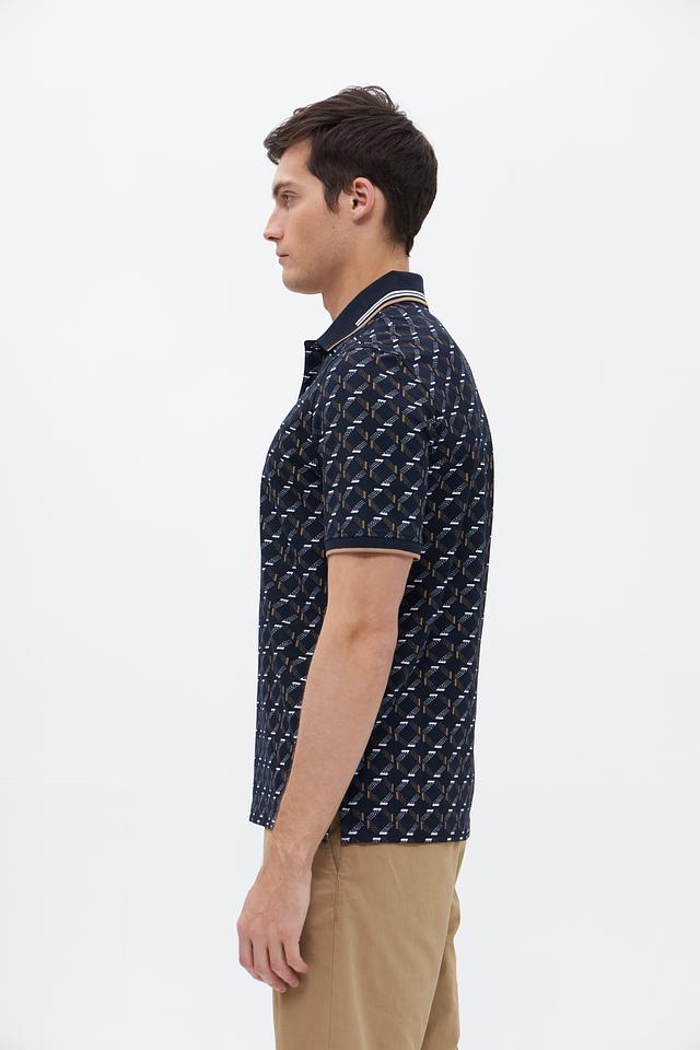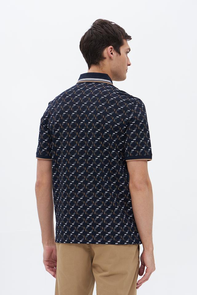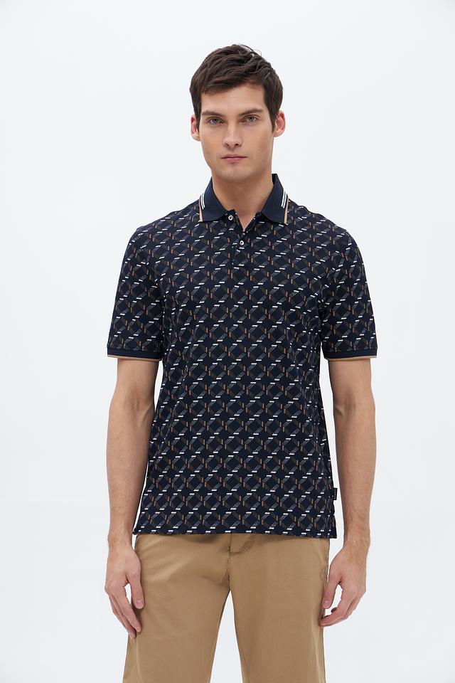 Мужское поло Bugatti тёмно-синего цвета с оригинальным геометрическим принтом. Изготовлено из высококачественного хлопка с добавлением полиэстера и эластана для комфорта и долговечности. Состав: хлопок 52%, полиэстер 44%, эластан 4%