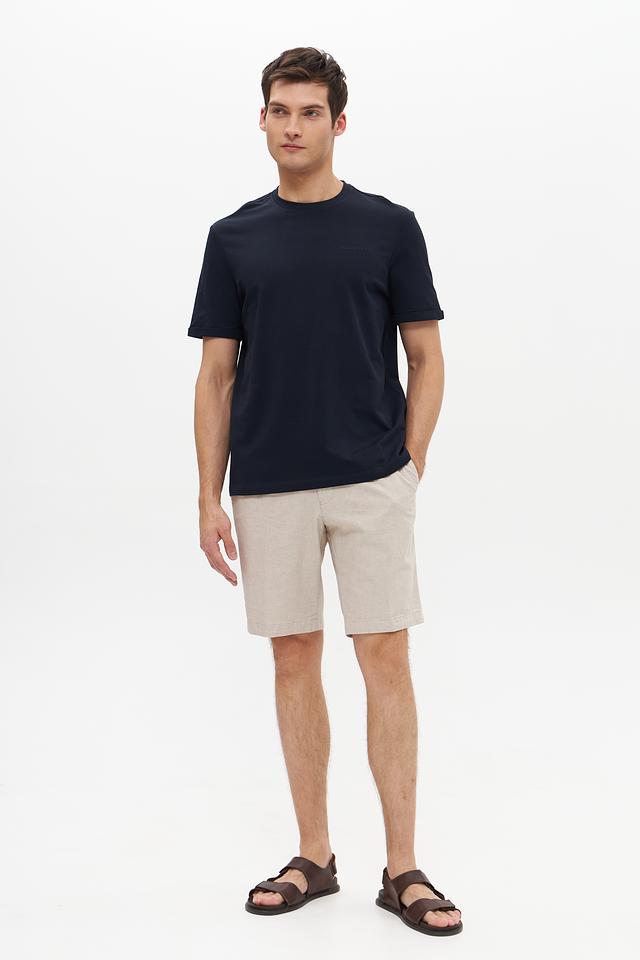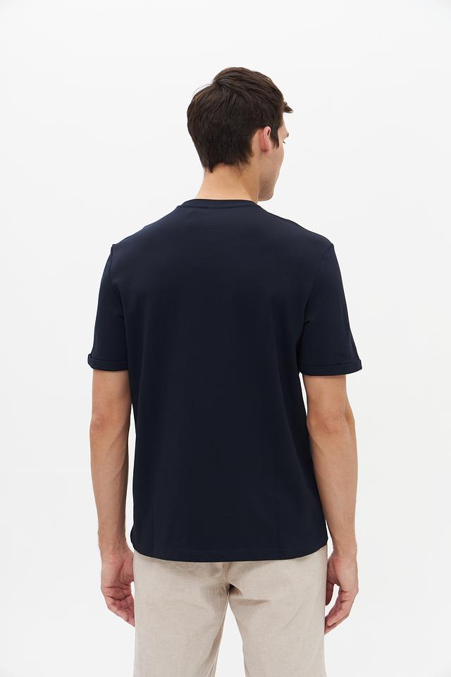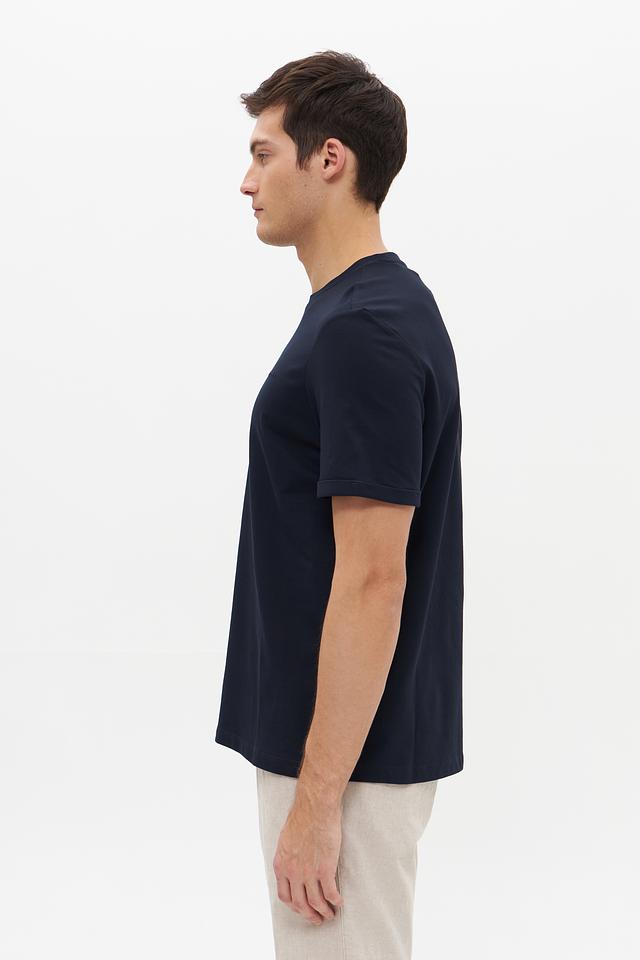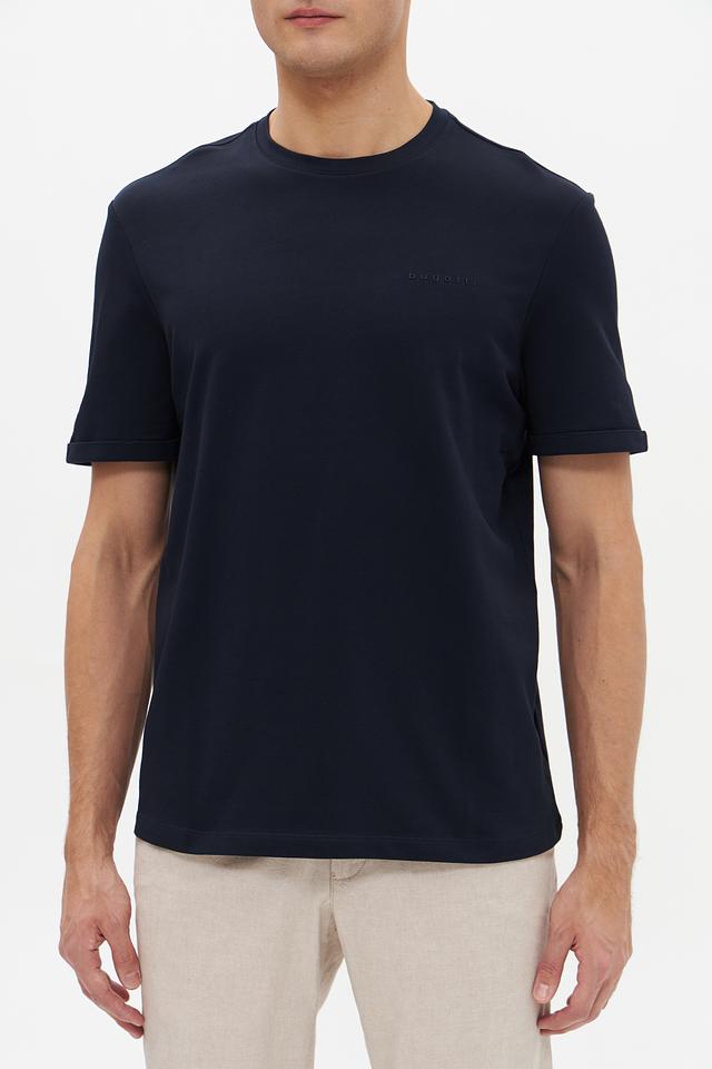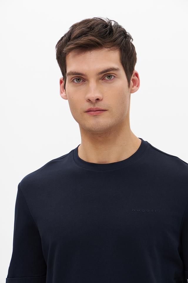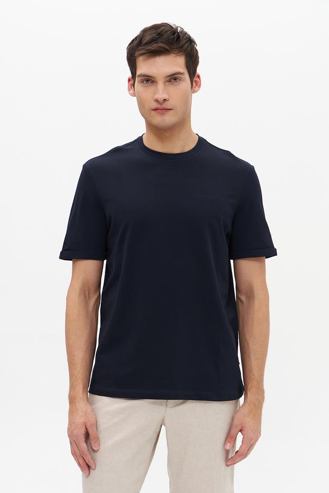 Футболка имеет насыщенный темно-синий цвет, который легко сочетается с различными элементами гардероба. На груди располагается небольшая, едва заметная вышивка с логотипом бренда Bugatti, добавляющая изделию элегантности.