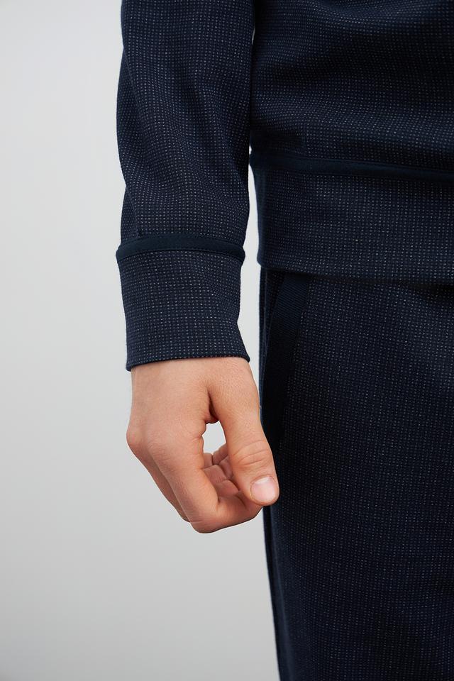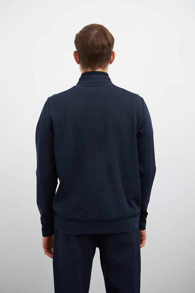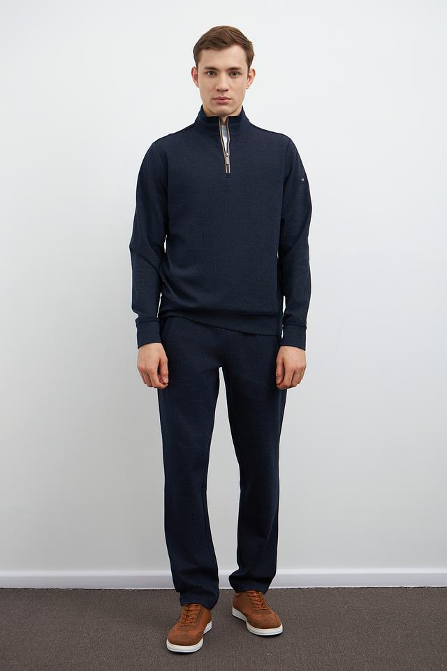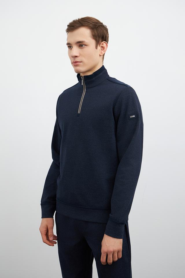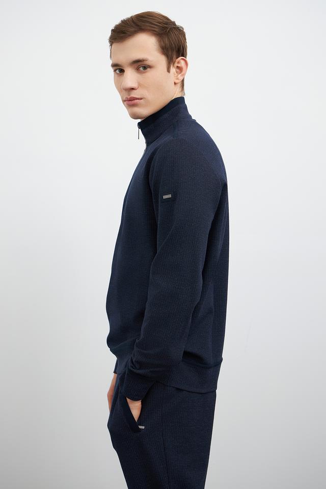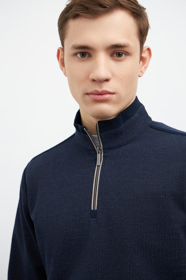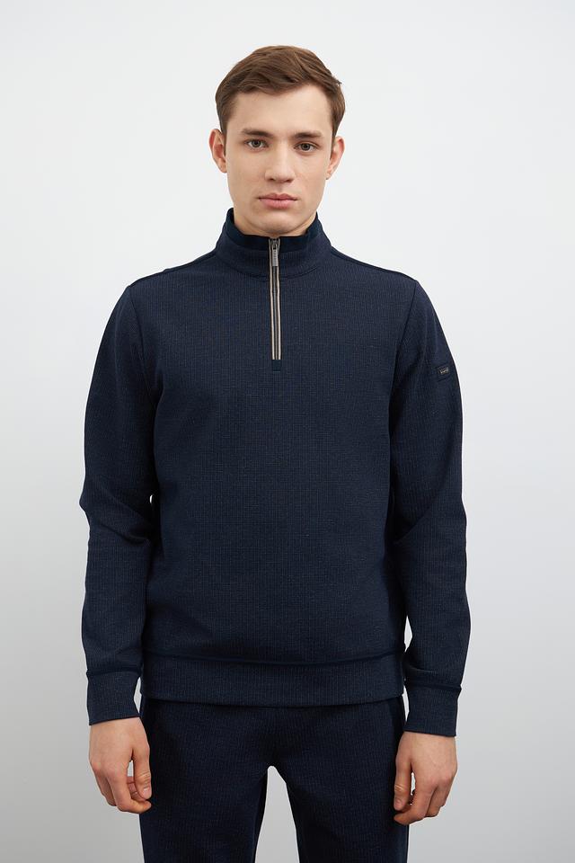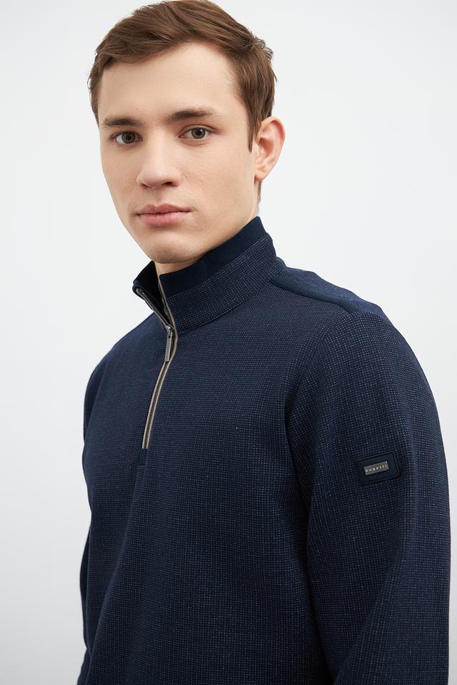 Мужской джемпер Bugatti темно-синего цвета с короткой молнией на воротнике. Изготовлен из фактурного трикотажа, имеет удобный крой и стильный дизайн. Подходит для создания повседневных образов. Состав: хлопок 47%, полиэстер 47%, эластан 6%