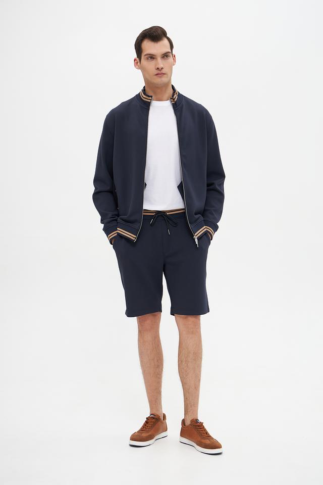 Мужской кардиган Bugatti тёмно-синего цвета с отделкой в тонкую полоску. Изготовлен из мягкого модала с добавлением полиэстера и эластана для комфорта и износостойкости. Состав: модал 54%, полиэстер 38%, эластан 8%