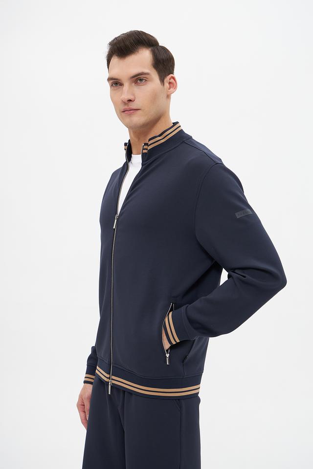 Модель имеет удобную застёжку-молнию, воротник-стойку и манжеты с тонкой полоской в бежево-золотистом цвете, что придает ей особый шарм. Кардиган выполнен из высококачественного модала, полиэстера и эластана, обеспечивающих мягкость, комфорт и хорошую посадку по фигуре.