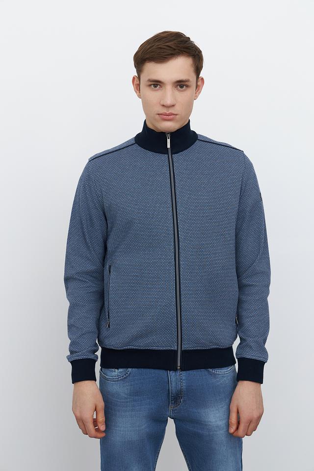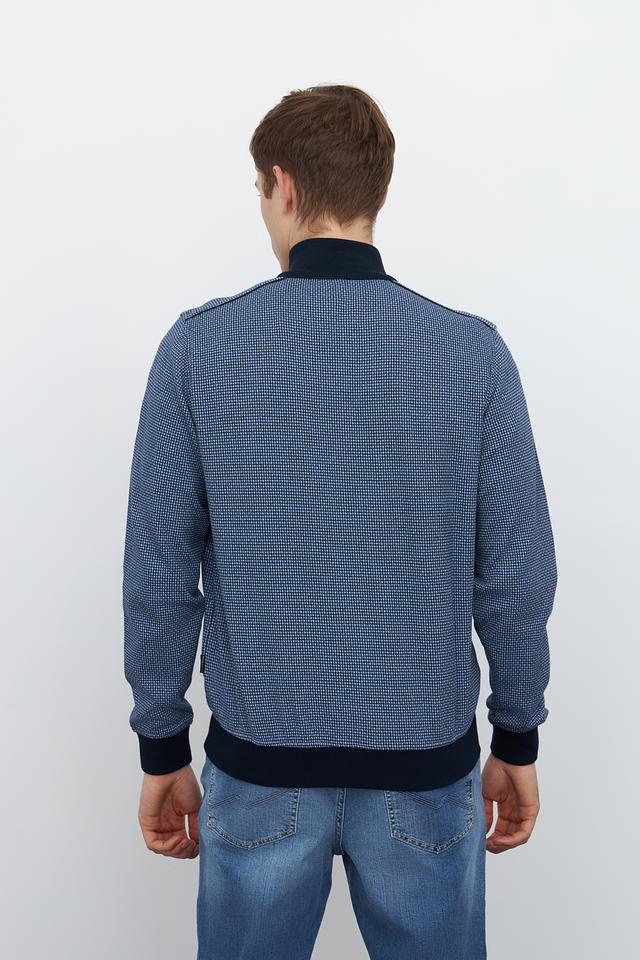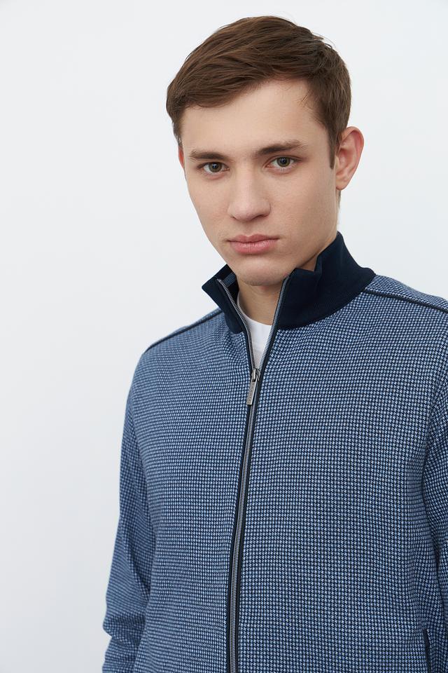 Кардиган имеет классический крой с застежкой-молнией, что позволяет легко регулировать степень тепла. Синий цвет с мелким геометрическим рисунком придает изделию современный и стильный вид. Эластичные манжеты и нижний край обеспечивают плотное прилегание, а также дополнительный комфорт.