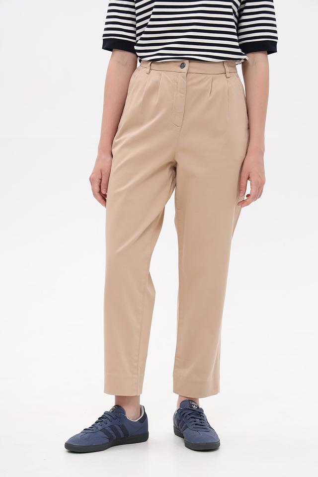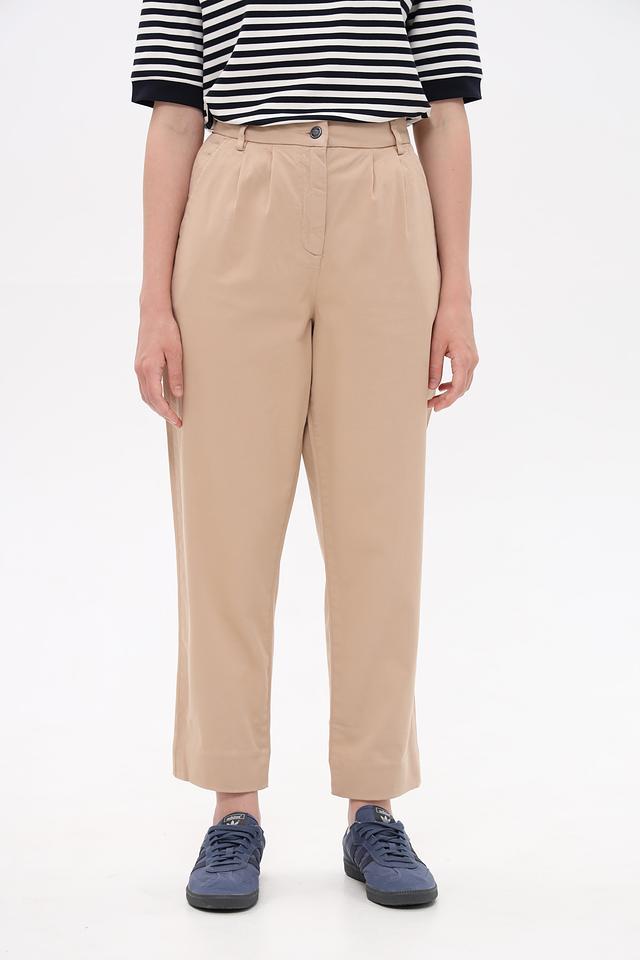 Брюки имеют прямой крой, пояс на пуговицу и аккуратные складки спереди, что придает им элегантный вид. Изготовлены из высококачественного хлопка с добавлением эластана, обеспечивающего комфорт при носке и сохранение формы.