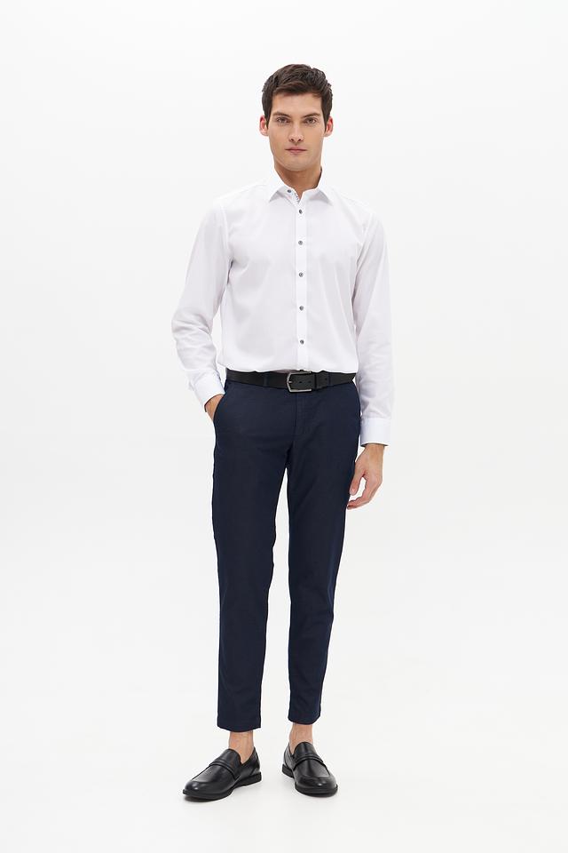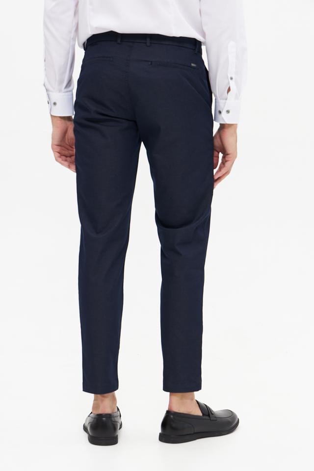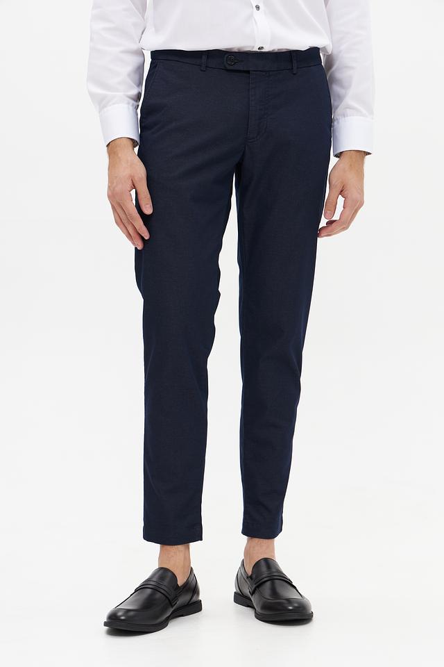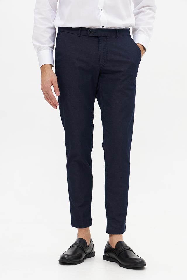 Основной цвет брюк – темно-синий, что делает их универсальными и подходящими для создания различных образов. Брюки имеют стандартную посадку на талии и застегиваются на молнию и пуговицу. На брюках присутствуют боковые и задние карманы.