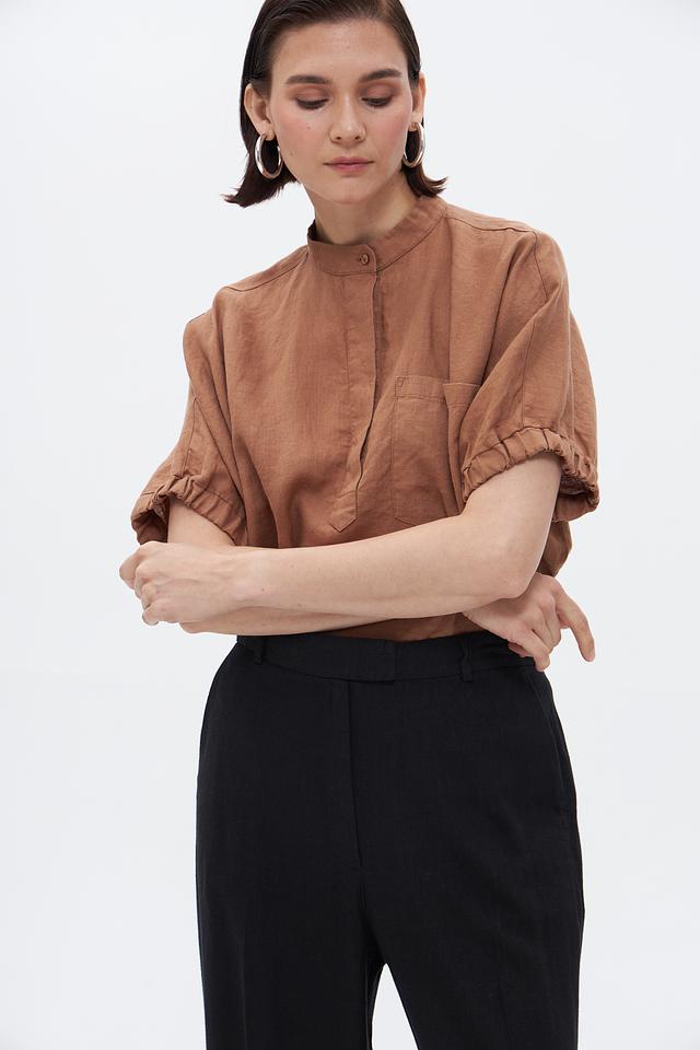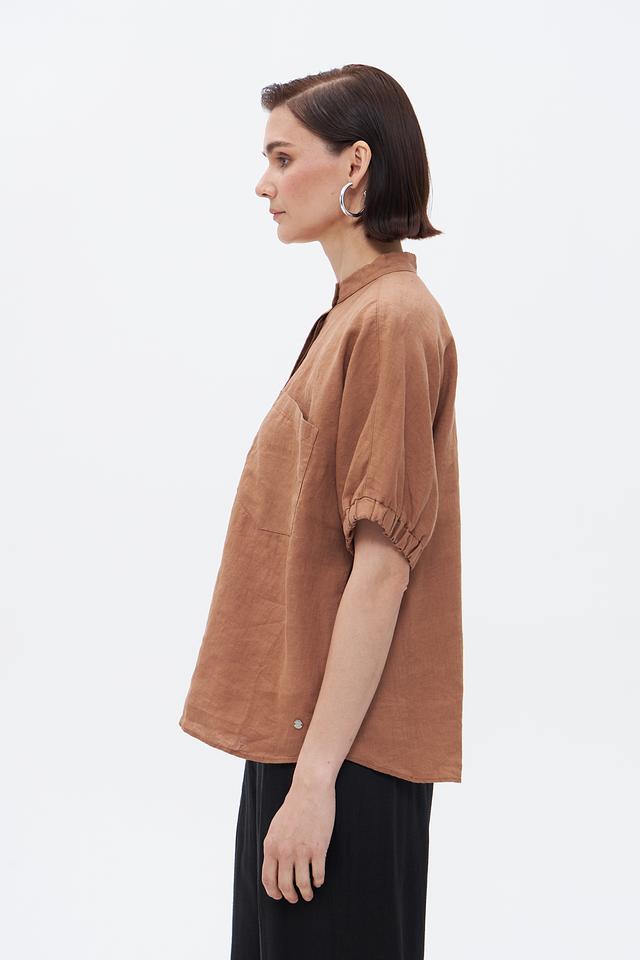 Коричневая блуза Bugatti из 100% льна – это стильное и комфортное решение для летнего гардероба. Модель с короткими рукавами и воротником-стойкой отличается свободным кроем и удобной посадкой. Состав: лен 100%