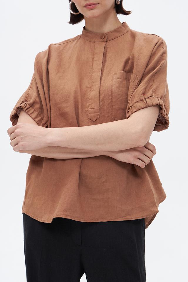 Блуза имеет свободный крой, который не сковывает движений и позволяет коже дышать. Воротник-стойка добавляет изысканности, а короткие рукава с небольшими сборками придают образу лёгкость и непринуждённость. На груди расположена накладная карман, который добавляет функциональности и стиля.